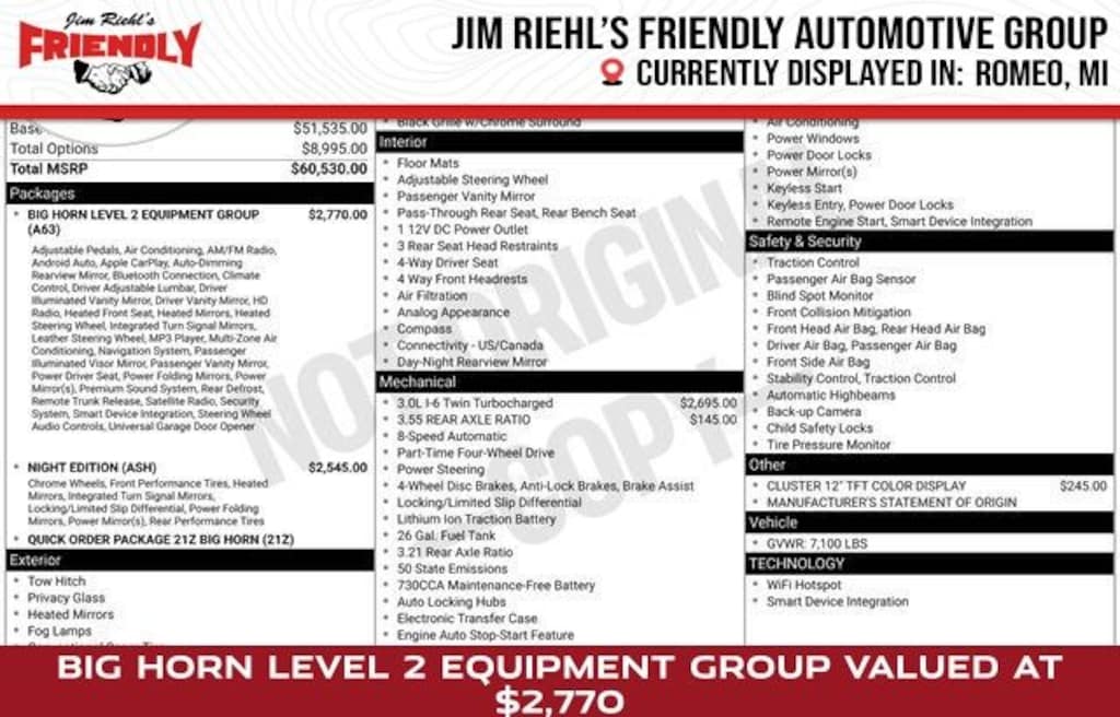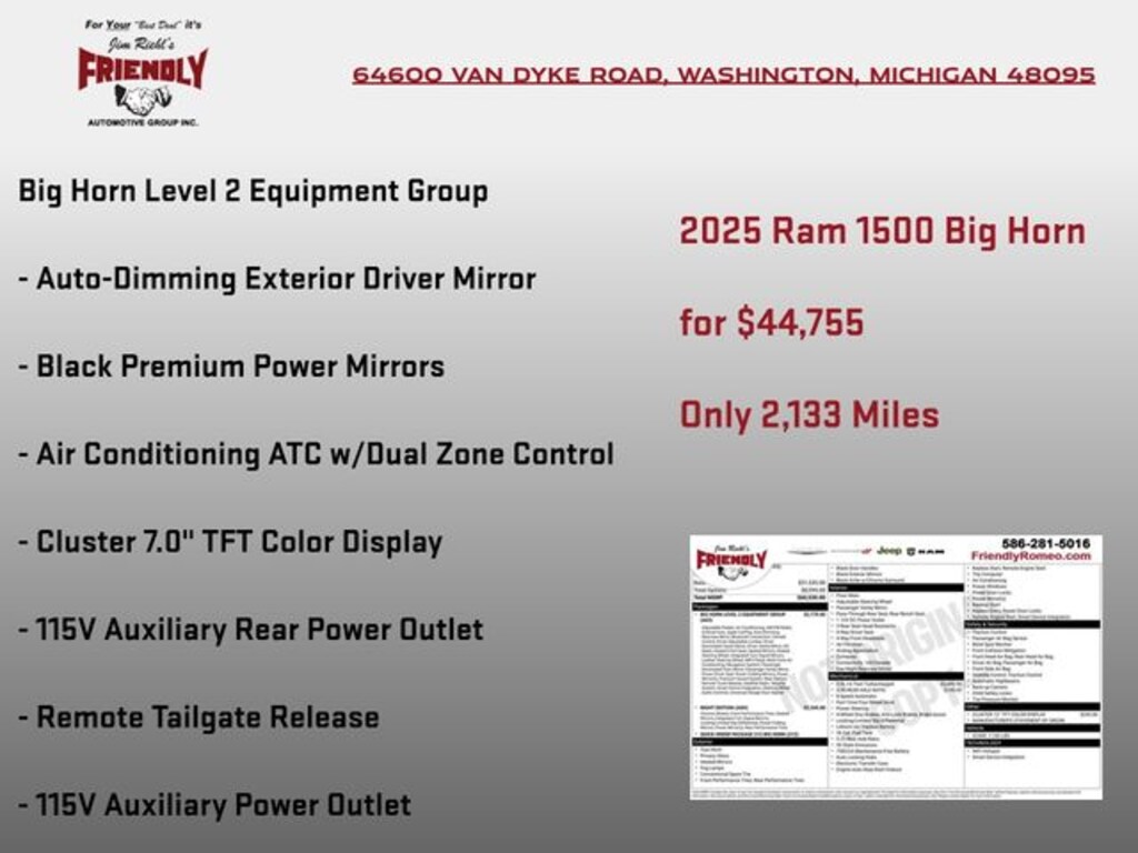 Check out all the standard equipment Big Horn Level 2 Equipment Group (115V Auxiliary Power Outlet, 115V Auxiliary Rear Power Outlet, 12" Touchscreen Display, 2nd Row In Floor Storage Bins, 400W Inverter, 4G LTE Wi-Fi Hot Spot, 9 Amplified Speakers w/Subwoofer, Air Conditioning ATC w/Dual Zone Control, Apple CarPlay, Auto Power-Folding Mirrors, Auto-Dimming Exterior Driver Mirror, Auto-Dimming Rear-View Mirror, Black Exterior Mirrors, Black Premium Power Mirrors, Cluster 7.0" TFT Color Display, Configurable Drive Mode, Connected Travel & Traffic Services, Connectivity - US/Canada, Convex Wide-Angle Exterior Mirror Insert, Exterior Mirrors Courtesy Lamps, Exterior Mirrors w/Heating Element, Exterior Mirrors w/Supplemental Signals, Glove Box Lamp, Google Android Auto, GPS Antenna Input, GPS Navigation, HD Radio, Heated Front Seats, Heated Steering Wheel, Integrated Voice Command w/Bluetooth, Leather Wrapped Steering Wheel, LED Dome Lamp w/On/Off Switch, LED Footwell Lighting, Media Hub w/2 Charge Only USBs, Overhead LED Lamps, Power 2-Way Driver