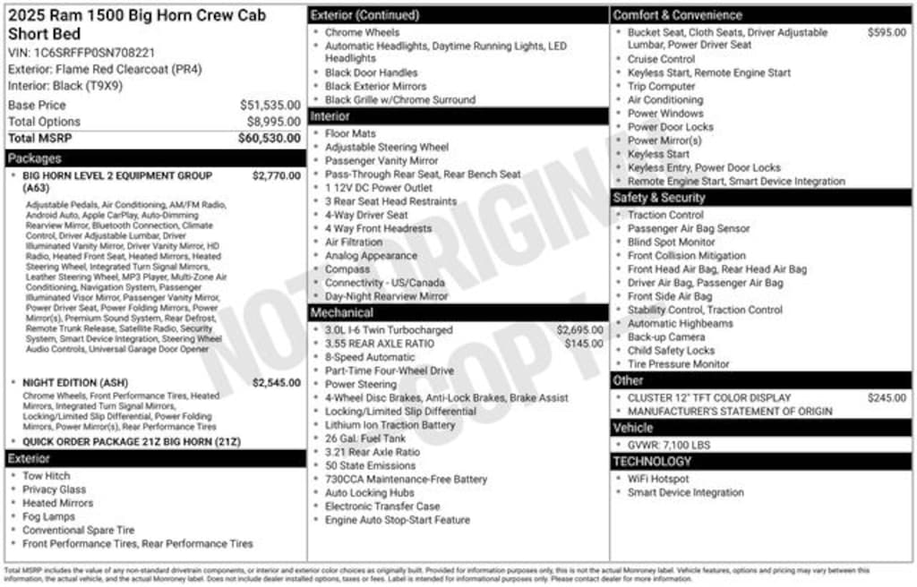 Clean CARFAX. CARFAX One-Owner. Odometer is 12768 miles below market average! 1500 Big Horn/Lone Star, 3.0L I6, 8-Speed Automatic, 4WD, 115V Auxiliary Power Outlet, 115V Auxiliary Rear Power Outlet, 12" Touchscreen Display, 2nd Row In Floor Storage Bins, 400W Inverter, 4G LTE Wi-Fi Hot Spot, 9 Amplified Speakers w/Subwoofer, Accent Color Door Handles, Accent Color Premium Power Mirrors, Accent Color Tailgate Handle, Air Conditioning ATC w/Dual Zone Control, Anti-Spin Differential Rear Axle, Apple CarPlay, Auto Power-Folding Mirrors, Auto-Dimming Exterior Driver Mirror, Auto-Dimming Rear-View Mirror, Big Horn Level 2 Equipment Group, Black Exterior Mirrors, Black Exterior Truck Badging, Black Headlamp Bezels, Black Interior Accents, Black Painted Exterior Mirrors Caps, Black Premium Power Mirrors, Black Tail Lamp Bezels, Body Color Front Bumper, Body Color Rear Bumper w/Step Pads, Cluster 7.0" TFT Color Display, Configurable Drive Mode, Connected Travel & Traffic Services, Connectivity - US/Canada, Convex Wide-Angle Exterior Mirror Insert, Deluxe Cloth Bucket Seats, Exterior Mirrors Courtesy Lamps, Exterior Mirrors w/Heating Element, Exterior Mirrors w/Supplemental Signals, Glove Box Lamp, Google Android Auto, GPS Antenna Input, GPS Navigation, Grille Black Surround Black Mesh, HD Radio, Heated Front Seats, Heated Steering Wheel, Integrated Voice Command w/Bluetooth, Leather Wrapped Steering Wheel, LED Dome Lamp w/On/Off Switch, LED Footwell Lighting, Media Hub w/2 Charge Only USBs, Night Edition, Overhead LED Lamps, Power 2-Way Driver Lumbar Adjust, Power Adjust 8-Way Driver Seat, Power Adjustable Pedals, Premium Overhead Console, Radio: Uconnect 5 Nav w/12.0" Display, RAM Grille Badge - Black, Rear Power Sliding Window, Rear Window Defroster, Remote Tailgate Release, Security Alarm, SiriusXM w/360L, Steering Wheel Mounted Audio Controls, Sun Visors w/Illuminated Vanity Mirrors, Universal Garage Door Opener, USB Host Flip, Wheels: 20" x 9.0" Aluminum Painted Clad.