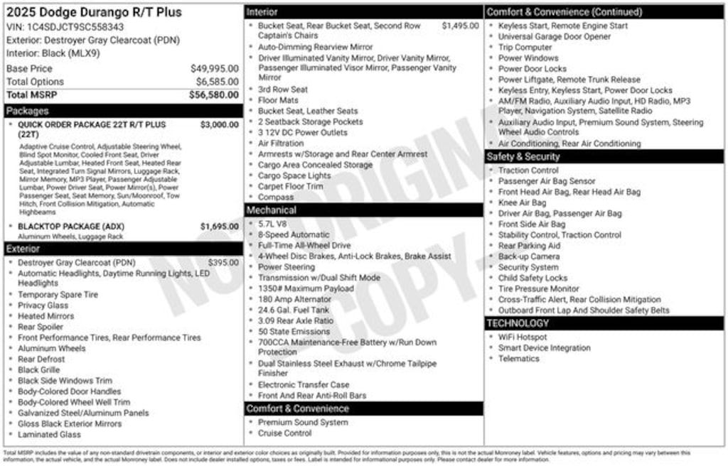 Check out all the standard equipment ParkView Rear Back-Up Camera (Black Roof Rails, Gloss Black Badges, Gloss Black Exterior Mirrors, Integrated Roof Rail Crossbars, Satin Black Dodge Tail Lamp Badge, and Wheels: 20" x 8.0" Black Noise Aluminum), Quick Order Package 22T R/T Plus (115V Auxiliary Power Outlet, 7 & 4 Pin Wiring Harness, Adaptive Cruise Control w/Stop, Auto High Beam Headlamp Control, Auto-Dimming Exterior Driver Mirror, Blind Spot w/Trailer Detection, Class IV Receiver Hitch, Dual Remote USB Port - Charge Only, Exterior Mirrors w/Heating Element, Exterior Mirrors w/Memory, Exterior Mirrors w/Supplemental Signals, Floor Console w/Leather Armrest, Full Speed Forward Collision Warning Plus, Heated Second Row Seats, Leather Trimmed Bucket Seats, Leather Wrapped Door Panels, LED Auxiliary Low Beam & Turn Signal, Power 6x9 Multi-Function Foldaway Mirrors, Power 8-Way Driver Memory 8-Way Passenger Seats, Power Driver/Passenger 4-Way Lumbar Adjust, Power Sunroof, Power Tilt & Telescopic Steering Column, Radio/Driver Seat/Mirrors Memory, Red Accent Stitching, Trailer Brake Control, and Ventilated Front Seats), AWD, 2nd Row Fold/Tumble Captain Chairs, 2nd Row Mini Console w/Cupholders, 2nd Row Seat Mounted Inboard Armrests, 3.09 Rear Axle Ratio, 3rd Row Floor Mat & Mini Console, 3rd row seats: split-bench, 4-Wheel Disc Brakes, 6-Passenger Seating, 9 Speakers, ABS brakes, Air Conditioning, Alloy wheels, AM/FM radio: SiriusXM w/360L, Apple CarPlay/Android Auto, Auto-dimming Rear-View mirror, Auto-leveling suspension, Automatic temperature control, Brake assist, Bumpers: body-color, Cloth Bucket Seats w/Shift Insert, Compass, Delay-off headlights, Driver door bin, Driver vanity mirror, Dual front impact airbags, Dual front side impact airbags, Electronic Stability Control, Emergency communication system: Dodge Connect, Four wheel independent suspension, Front anti-roll bar, Front Bucket Seats, Front Center Armrest w/Storage, Front dual zone A/C, Front reading lights, Fully automatic headlights, Garage door transmitter, Heated door mirrors, Heated front seats, Heated steering wheel, Illuminated entry, Knee airbag, Leather steering wheel, Low tire pressure warning, Navigation System, Occupant sensing airbag, Outside temperature display, Overhead airbag, Overhead console, Panic alarm, ParkView Rear Back-Up Camera, Passenger door bin, Passenger vanity mirror, Power door mirrors, Power driver seat, Power Liftgate, Power steering, Power windows, Radio data system, Radio: Uconnect 5 Nav w/10.1" Display, Rain sensing wipers, Rear air conditioning, Rear anti-roll bar, Rear Load Leveling Suspension, Rear reading lights, Rear seat center armrest, Rear window defroster, Rear window wiper, Remote keyless entry, Security system, Speed control, Speed-sensing steering, Speed-Sensitive Wipers, Split folding rear seat, Spoiler, Sport steering wheel, Steering wheel mounted audio controls, Tachometer, Telescoping steering wheel, Tilt steering wheel, Traction control, Trip computer, Variably intermittent wipers, Vo