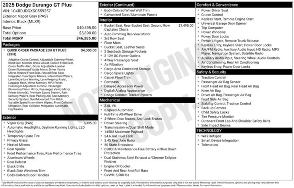 Check out all the standard equipment Quick Order Package 2BH GT Plus (115V Auxiliary Power Outlet, 180 Amp Alternator, 506 Watt Amplifier, 7 & 4 Pin Wiring Harness, 9 Alpine Amplified Speakers w/Subwoofer, Adaptive Cruise Control w/Stop, Advanced Brake Assist, Auto High Beam Headlamp Control, Auto-Dimming Exterior Driver Mirror, Black Roof Rails, Blind Spot w/Trailer Detection, Bright Cargo Area Scuff Pads, Bright Front Door Sill Scuff Pads, Class IV Receiver Hitch, Dual Remote USB Port - Charge Only, Exterior Mirrors w/Heating Element, Exterior Mirrors w/Memory, Exterior Mirrors w/Supplemental Signals, Full Speed Forward Collision Warning Plus, Gloss Black Exterior Mirrors, Heated Second Row Seats, Heavy-Duty Engine Cooling, Integrated Roof Rail Crossbars, Lane Departure Warning Plus, Leather Trimmed Bucket Seats, Leather Wrapped Door Panels, LED Auxiliary Low Beam & Turn Signal, ParkSense Front/Rear Park Assist w/Stop, Power 6x9 Multi-Function Foldaway Mirrors, Power Driver/Passenger 4-Way Lumbar Adjust, Power Sunroof, Power Tilt & Telescopic Steering Column, Radio/Driver Seat/Mirrors Memory, Rain Sensitive Windshield Wipers, Rear Load Leveling Suspension, Red Accent Stitching, Security Alarm, Sun Visors w/Illuminated Vanity Mirrors, Trailer Brake Control, Ventilated Front Seats, and Wireless Charging Pad), AWD, 2nd Row Fold/Tumble Captain Chairs, 2nd Row Mini Console w/Cupholders, 2nd Row Seat Mounted Inboard Armrests, 3.45 Rear Axle Ratio, 3rd Row Floor Mat & Mini Console, 3rd row seats: split-bench, 4-Wheel Disc Brakes, 6 Speakers, 6-Passenger Seating, ABS brakes, Air Conditioning, Alloy wheels, AM/FM radio: SiriusXM w/360L, Apple CarPlay/Android Auto, Auto-dimming Rear-View mirror, Automatic temperature control, Brake assist, Bumpers: body-color, Cloth Bucket Seats w/Shift Insert, Compass, Delay-off headlights, Driver door bin, Driver vanity mirror, Dual front impact airbags, Dual front side impact airbags, Electronic Stability Control, Emergency communication system: Dodge Connect, Four wheel independent suspension, Front anti-roll bar, Front Bucket Seats, Front Center Armrest w/Storage, Front dual zone A/C, Front reading lights, Fully automatic headlights, Garage door transmitter, Heated door mirrors, Heated front seats, Heated steering wheel, Illuminated entry, Knee airbag, Leather steering wheel, Low tire pressure warning, Navigation System, Occupant sensing airbag, Outside temperature display, Overhead airbag, Overhead console, Panic alarm, ParkView Rear Back-Up Camera, Passenger door bin, Passenger vanity mirror, Power door mirrors, Power driver seat, Power Liftgate, Power steering, Power windows, Radio data system, Radio: Uconnect 5 Nav w/10.1" Display, Rear air conditioning, Rear anti-roll bar, Rear reading lights, Rear seat center armrest, Rear window defroster, Rear window wiper, Remote keyless entry, Speed control, Speed-sensing steering, Speed-Sensitive Wipers, Split folding rear seat, Spoiler, Sport steering wheel, Steering wheel mounted audio controls, Tachometer, Telescoping steering wheel, Tilt steering wheel