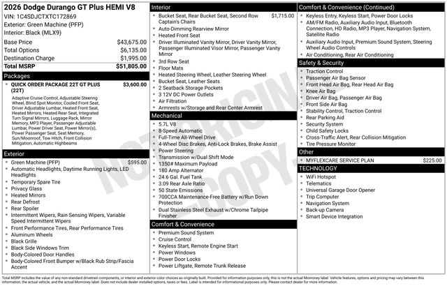 2026 Dodge Durango GT Plus HEMI V8 CTP Green Machine AWD CTP HEMI 5.7L V8 Multi Displacement VVT 8-Speed Automatic