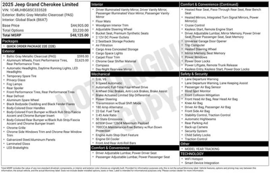 2025 Jeep Grand Cherokee Limited Baltic Gray Metallic Clearcoat 4WD 3.6L V6 24V VVT 8-Speed Automatic 19/26 City/Highway MPG