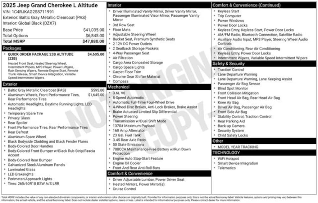 Check out all the standard equipment Altitude Appearance Package, Quick Order Package 23B Altitude (115V Auxiliary Power Outlet, 3rd Row Charge-Only USB Ports, Black Headliner, Capri Leatherette/Suede Seats, Delete Laredo Badge, Gloss Black Exterior Accents, Heated Front Seats, Heated Steering Wheel, Power Liftgate, Rain Sensitive Windshield Wipers, Remote Start System, Selectable Tire Fill Alert, Wheels: 18" x 8.0" Fully Painted Aluminum 1, and Wireless Charging Pad), 3.45 Rear Axle Ratio, 3rd row seats: split-bench, 4-Wheel Disc Brakes, 6 Speakers, ABS brakes, Air Conditioning, Alloy wheels, AM/FM radio: SiriusXM, Anti-whiplash front head restraints, Automatic temperature control, Brake assist, Bumpers: body-color, Cloth Seats, Compass, Delay-off headlights, Driver door bin, Driver vanity mirror, Dual front impact airbags, Dual front side impact airbags, Electronic Stability Control, Emergency communication system, Four wheel independent suspension, Front anti-roll bar, Front Bucket Seats, Front Center Armrest w/Storage, Front dual zone A/C, Front reading lights, Fully automatic headlights, Heated door mirrors, Illuminated entry, Knee airbag, Low tire pressure warning, Manual Fold Seatbacks, Model Year Tracking, Normal Duty Suspension, Occupant sensing airbag, Outside temperature display, Overhead airbag, Overhead console, Panic alarm, ParkView Rear Back-Up Camera, Passenger door bin, Passenger vanity mirror, Power door mirrors, Power driver seat, Power steering, Power windows, Radio data system, Radio: Uconnect 5 w/8.4" Display, Rear air conditioning, Rear anti-roll bar, Rear reading lights, Rear window defroster, Rear window wiper, Reclining 3rd row seat, Remote keyless entry, Security system, Speed control, Speed-Sensitive Wipers, Split folding rear seat, Spoiler, Steering wheel mounted audio controls, Tachometer, Telescoping steering wheel, Tilt steering wheel, Traction control, Trip computer, Variably intermittent wipers, Voltmeter, Wheels: 18" x 8.0" Fully Painted Aluminum, and Wheels: 20" x 8.5" Gloss Black Painted Aluminum. Price includes: $2000 - 2025 National Retail Bonus Cash . Exp. 11/03/2025