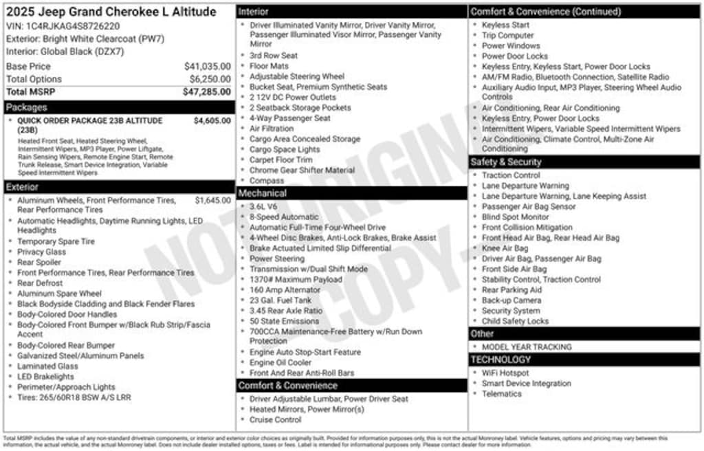 Check out all the standard equipment Altitude Appearance Package, Quick Order Package 23B Altitude (115V Auxiliary Power Outlet, 3rd Row Charge-Only USB Ports, Black Headliner, Capri Leatherette/Suede Seats, Delete Laredo Badge, Gloss Black Exterior Accents, Heated Front Seats, Heated Steering Wheel, Power Liftgate, Rain Sensitive Windshield Wipers, Remote Start System, Selectable Tire Fill Alert, Wheels: 18" x 8.0" Fully Painted Aluminum 1, and Wireless Charging Pad), 3.45 Rear Axle Ratio, 3rd row seats: split-bench, 4-Wheel Disc Brakes, 6 Speakers, ABS brakes, Air Conditioning, Alloy wheels, AM/FM radio: SiriusXM, Anti-whiplash front head restraints, Automatic temperature control, Brake assist, Bumpers: body-color, Cloth Seats, Compass, Delay-off headlights, Driver door bin, Driver vanity mirror, Dual front impact airbags, Dual front side impact airbags, Electronic Stability Control, Emergency communication system, Four wheel independent suspension, Front anti-roll bar, Front Bucket Seats, Front Center Armrest w/Storage, Front dual zone A/C, Front reading lights, Fully automatic headlights, Heated door mirrors, Illuminated entry, Knee airbag, Low tire pressure warning, Manual Fold Seatbacks, Model Year Tracking, Normal Duty Suspension, Occupant sensing airbag, Outside temperature display, Overhead airbag, Overhead console, Panic alarm, ParkView Rear Back-Up Camera, Passenger door bin, Passenger vanity mirror, Power door mirrors, Power driver seat, Power steering, Power windows, Radio data system, Radio: Uconnect 5 w/8.4" Display, Rear air conditioning, Rear anti-roll bar, Rear reading lights, Rear window defroster, Rear window wiper, Reclining 3rd row seat, Remote keyless entry, Security system, Speed control, Speed-Sensitive Wipers, Split folding rear seat, Spoiler, Steering wheel mounted audio controls, Tachometer, Telescoping steering wheel, Tilt steering wheel, Traction control, Trip computer, Variably intermittent wipers, Voltmeter, Wheels: 18" x 8.0" Fully Painted Aluminum, and Wheels: 20" x 8.5" Gloss Black Painted Aluminum. Price includes: $1000 - 2025 National Grand Cherokee Loyalty Retail Bonus Cash . Exp. 11/03/2025 $2000 - 2025 National Retail Bonus Cash . Exp. 11/03/2025 $500 - 2025 National Jeep Monopoly Money Bonus Cash . Exp. 11/03/2025