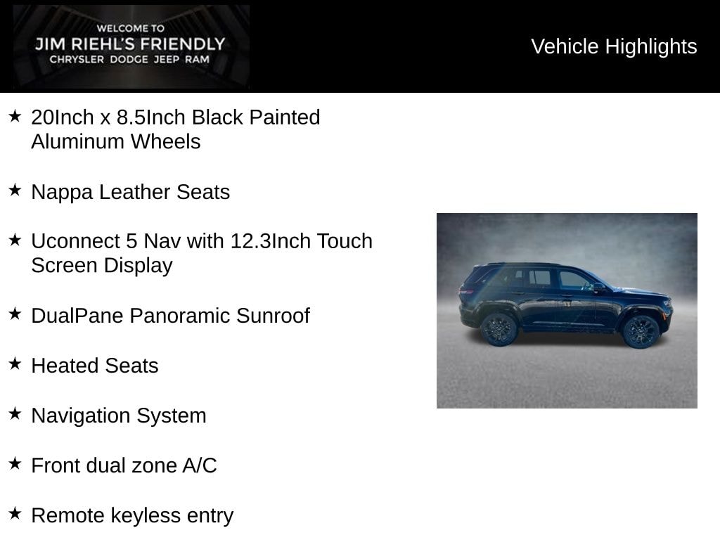 20Inch x 8.5Inch Black Painted Aluminum Wheels, Nappa Leather Seats, Uconnect 5 Nav with 12.3Inch Touch Screen Display, DualPane Panoramic Sunroof, Heated Seats, 4WD, ABS brakes, Alloy wheels, Compass, Electronic Stability Control, Emergency communication system, Front dual zone A/C, Heated door mirrors, Heated Exterior Mirrors, Heated front seats, Heated rear seats, Illuminated entry, Low tire pressure warning, Manual Folding Exterior Mirrors, Navigation System, ParkView Rear Back-Up Camera, Power Liftgate, Remote keyless entry, Traction control.