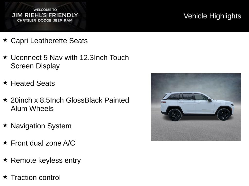 Capri Leatherette Seats, Uconnect 5 Nav with 12.3Inch Touch Screen Display, Heated Seats, 20inch x 8.5Inch GlossBlack Painted Alum Wheels, 4WD, ABS brakes, Alloy wheels, Compass, Electronic Stability Control, Emergency communication system, Front dual zone A/C, Heated door mirrors, Heated Exterior Mirrors, Heated front seats, Heated rear seats, Illuminated entry, Low tire pressure warning, Manual Folding Exterior Mirrors, Navigation System, ParkView Rear Back-Up Camera, Power Liftgate, Remote keyless entry, Traction control.