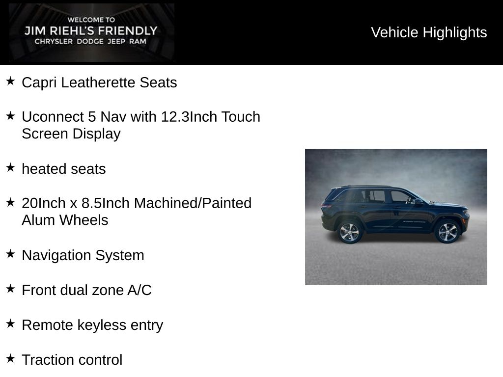 Capri Leatherette Seats, Uconnect 5 Nav with 12.3Inch Touch Screen Display, heated seats, 20Inch x 8.5Inch Machined/Painted Alum Wheels, 4WD, ABS brakes, Alloy wheels, Compass, Electronic Stability Control, Emergency communication system, Front dual zone A/C, Heated door mirrors, Heated Exterior Mirrors, Heated front seats, Heated rear seats, Illuminated entry, Low tire pressure warning, Manual Folding Exterior Mirrors, Navigation System, ParkView Rear Back-Up Camera, Power Liftgate, Remote keyless entry, Traction control.