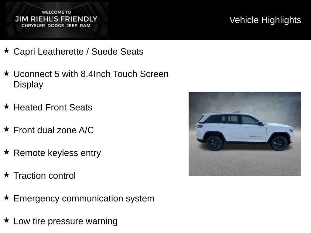 Capri Leatherette / Suede Seats, Uconnect 5 with 8.4Inch Touch Screen Display, Heated Front Seats, 4WD, ABS brakes, Active Cruise Control, Alloy wheels, Compass, Electronic Stability Control, Emergency communication system, Front dual zone A/C, Heated door mirrors, Heated Exterior Mirrors, Illuminated entry, Low tire pressure warning, Manual Folding Exterior Mirrors, ParkView Rear Back-Up Camera, Remote keyless entry, Traction control.