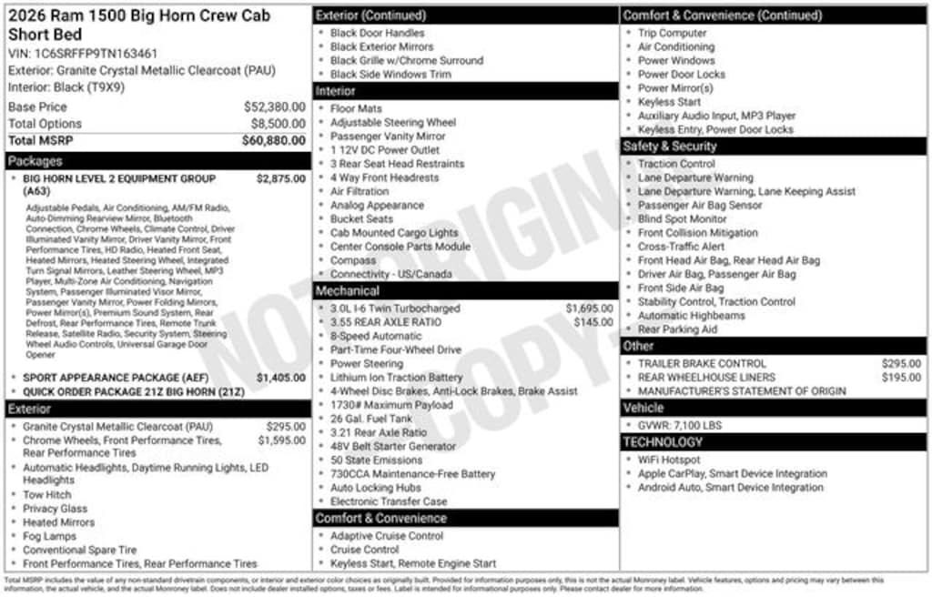 Check out all the standard equipment Big Horn Level 2 Equipment Group (115V Auxiliary Power Outlet, 115V Auxiliary Rear Power Outlet, 12" Touchscreen Display, 2nd Row In Floor Storage Bins, 3 Rear Seat Head Restraints, 4 Way Front Headrests, 400W Inverter, 4G LTE Wi-Fi Hot Spot, 9 Amplified Speakers w/Subwoofer, Air Conditioning ATC w/Dual Zone Control, Apple CarPlay, Auto Power-Folding Mirrors, Auto-Dimming Exterior Driver Mirror, Auto-Dimming Rear-View Mirror, Black Exterior Mirrors, Black Premium Power Mirrors, Body Color Fender Flares, Bucket Seats, Center Console Parts Module, Cluster 7.0" TFT Color Display, Configurable Drive Mode, Connected Travel & Traffic Services, Connectivity - US/Canada, Convex Wide-Angle Exterior Mirror Insert, Deluxe Cloth Bucket Seats, Disassociated Touchscreen Display, Exterior Mirrors Courtesy Lamps, Exterior Mirrors w/Heating Element, Exterior Mirrors w/Supplemental Signals, Front Seat Back Map Pockets, Full Length Floor Console, Global Telematics Box Module (TBM), Glove Box Lamp, Google Android Auto, GPS Antenna Input, GPS Navigation, HD Radio, Heated Front Seats, Heated Steering Wheel, Integrated Center Stack Radio, Integrated Voice Command w/Bluetooth, Leather Wrapped Steering Wheel, LED Dome Lamp w/On/Off Switch, LED Footwell Lighting, Manual Adjust 4-Way Front Passenger Seat, Media Hub w/2 Charge Only USBs, Overhead LED Lamps, Power 2-Way Driver Lumbar Adjust, Power Adjust 8-Way Driver Seat, Power Adjustable Pedals, Premium Overhead Console, Radio: Uconnect 5 Nav w/12.0" Display, Rear 60/40 Folding Seat, Rear Center Armrest, Rear Power Sliding Window, Rear Window Defroster, Remote Tailgate Release, Secondary Active Grille Shutters, Security Alarm, SiriusXM Radio Service, SiriusXM w/360L, Steering Wheel Mounted Audio Controls, Sun Visors w/Illuminated Vanity Mirrors, Universal Garage Door Opener, USB Host Flip, Wheels: 20" x 9" Aluminum Chrome Clad (WRK), and Wireless Charging Pad), Quick Order Package 21Z Big Horn, Sport Appearance Package (Black Interior Accents, Body Color Door Handles, Body Color Front Bumper, Body Color Rear Bumper w/Step Pads, Body Color Tailgate Handle, Grille Surround 1 Body Color Texture 1 Black, and RAM Grille Badge - Chrome), 4-Wheel Disc Brakes, 48V Belt Starter Generator, 6 Speakers, ABS brakes, Air Conditioning, Alloy wheels, AM/FM radio, Apple CarPlay/Android Auto, Auto High-beam Headlights, Brake assist, Bumpers: chrome, Cloth Bucket Seats, Compass, Delay-off headlights, Driver door bin, Dual front impact airbags, Dual front side impact airbags, Electronic Stability Control, Front anti-roll bar, Front Bucket Seats, Front Center Armrest w/Storage, Front fog lights, Front reading lights, Front wheel independent suspension, Fully automatic headlights, Heated door mirrors, Illuminated entry, Low tire pressure warning, Manual Adjust 4-Way Driver Seat, Manual Folding Exterior Mirrors, Manufacturer's Statement of Origin, Occupant sensing airbag, Outside temperature display, Overhead airbag, Over Price includes: $3500 - 2026 National Retail Consumer C