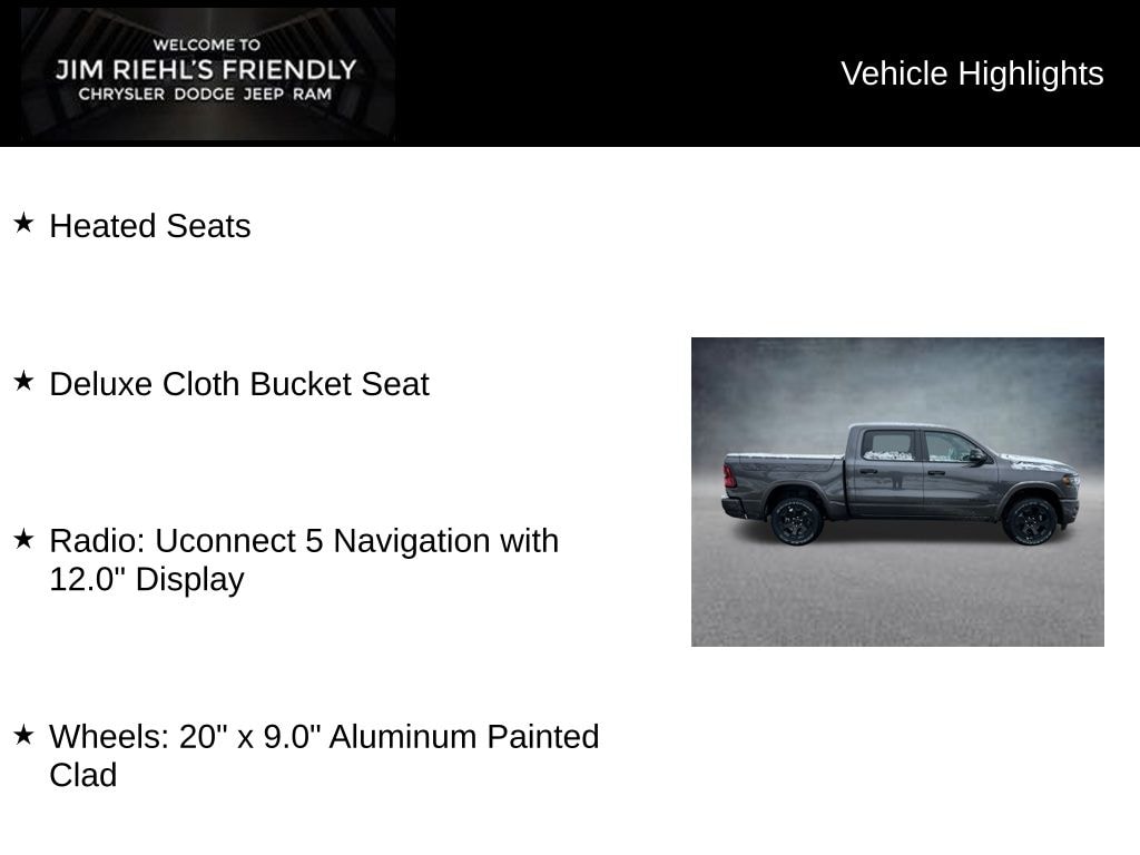 Heated Seats, Deluxe Cloth Bucket Seat, Radio: Uconnect 5 Navigation with 12.0 Display, Wheels: 20 x 9.0 Aluminum Painted Clad.