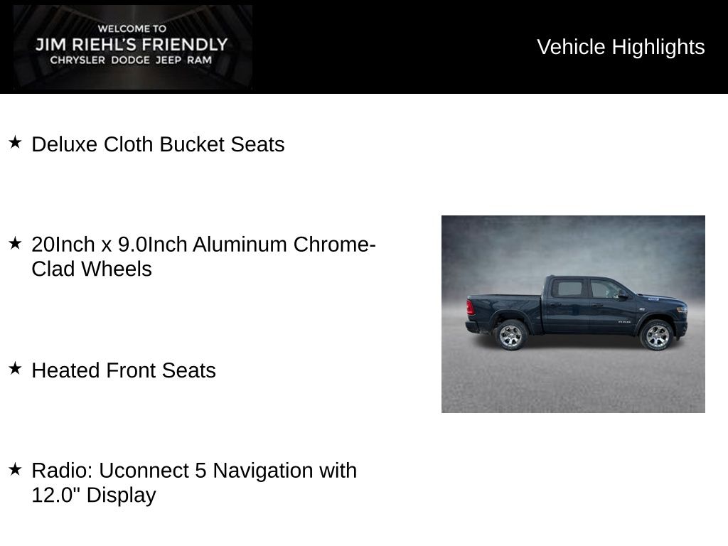 Deluxe Cloth Bucket Seats, 20Inch x 9.0Inch Aluminum Chrome-Clad Wheels, Heated Front Seats, Radio: Uconnect 5 Navigation with 12.0 Display.