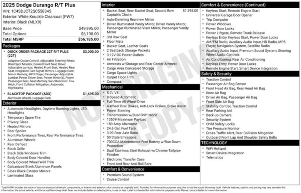 Check out all the standard equipment ParkView Rear Back-Up Camera (Black Roof Rails, Gloss Black Badges, Gloss Black Exterior Mirrors, Integrated Roof Rail Crossbars, Satin Black Dodge Tail Lamp Badge, and Wheels: 20" x 8.0" Black Noise Aluminum), Quick Order Package 22T R/T Plus (115V Auxiliary Power Outlet, 7 & 4 Pin Wiring Harness, Adaptive Cruise Control w/Stop, Auto High Beam Headlamp Control, Auto-Dimming Exterior Driver Mirror, Blind Spot w/Trailer Detection, Class IV Receiver Hitch, Dual Remote USB Port - Charge Only, Exterior Mirrors w/Heating Element, Exterior Mirrors w/Memory, Exterior Mirrors w/Supplemental Signals, Floor Console w/Leather Armrest, Full Speed Forward Collision Warning Plus, Heated Second Row Seats, Leather Trimmed Bucket Seats, Leather Wrapped Door Panels, LED Auxiliary Low Beam & Turn Signal, Power 6x9 Multi-Function Foldaway Mirrors, Power 8-Way Driver Memory 8-Way Passenger Seats, Power Driver/Passenger 4-Way Lumbar Adjust, Power Sunroof, Power Tilt & Telescopic Steering Column, Radio/Driver Seat/Mirrors Memory, Red Accent Stitching, Trailer Brake Control, and Ventilated Front Seats), AWD, 2nd Row Fold/Tumble Captain Chairs, 2nd Row Mini Console w/Cupholders, 2nd Row Seat Mounted Inboard Armrests, 3.09 Rear Axle Ratio, 3rd Row Floor Mat & Mini Console, 3rd row seats: split-bench, 4-Wheel Disc Brakes, 6-Passenger Seating, 9 Speakers, ABS brakes, Air Conditioning, Alloy wheels, AM/FM radio: SiriusXM w/360L, Apple CarPlay/Android Auto, Auto-dimming Rear-View mirror, Auto-leveling suspension, Automatic temperature control, Brake assist, Bumpers: body-color, Cloth Bucket Seats w/Shift Insert, Compass, Delay-off headlights, Driver door bin, Driver vanity mirror, Dual front impact airbags, Dual front side impact airbags, Electronic Stability Control, Emergency communication system: Dodge Connect, Four wheel independent suspension, Front anti-roll bar, Front Bucket Seats, Front Center Armrest w/Storage, Front dual zone A/C, Front reading lights, Fully automatic headlights, Garage door transmitter, Heated door mirrors, Heated front seats, Heated steering wheel, Illuminated entry, Knee airbag, Leather steering wheel, Low tire pressure warning, Navigation System, Occupant sensing airbag, Outside temperature display, Overhead airbag, Overhead console, Panic alarm, ParkView Rear Back-Up Camera, Passenger door bin, Passenger vanity mirror, Power door mirrors, Power driver seat, Power Liftgate, Power steering, Power windows, Radio data system, Radio: Uconnect 5 Nav w/10.1" Display, Rain sensing wipers, Rear air conditioning, Rear anti-roll bar, Rear Load Leveling Suspension, Rear reading lights, Rear seat center armrest, Rear window defroster, Rear window wiper, Remote keyless entry, Security system, Speed control, Speed-sensing steering, Speed-Sensitive Wipers, Split folding rear seat, Spoiler, Sport steering wheel, Steering wheel mounted audio controls, Tachometer, Telescoping steering wheel, Tilt steering wheel, Traction control, Trip computer, Variably intermittent wipers, Vol