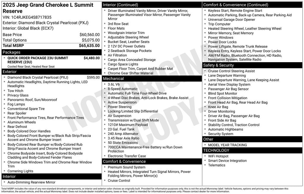 Check out all the standard equipment Quick Order Package 23U Summit Reserve (19 Speakers High Performance Audio, 950 Watt Amplifier, Active Noise Control System, Deluxe Headliner, Front Passenger Interactive Display, Palermo Leather Door Trim, Palermo Leather Seats, Summit, Summit Badge, Ventilated Rear Seats, and Wheels: 21 x 9.0 Machined Face/Painted Aluminum), Two Tone Paint Group, 10 Speakers, 3.45 Rear Axle Ratio, 3rd row seats: split-bench, 4-Wheel Disc Brakes, ABS brakes, Adaptive suspension, Air Conditioning, Alloy wheels, AM/FM radio: SiriusXM with 360L, Anti-whiplash front head restraints, Audio memory, Auto High-beam Headlights, Auto-dimming door mirrors, Auto-dimming Rear-View mirror, Auto-leveling suspension, Automatic temperature control, Brake assist, Bumpers: body-color, Compass, Delay-off headlights, Driver door bin, Driver vanity mirror, Dual front impact airbags, Dual front side impact airbags, Electronic Stability Control, Emergency communication system, Four wheel independent suspension, Front anti-roll bar, Front Bucket Seats, Front Center Armrest w/Storage, Front dual zone A/C, Front fog lights, Front reading lights, Fully automatic headlights, Garage door transmitter, Genuine wood dashboard insert, Genuine wood door panel insert, Heated door mirrors, Heated front seats, Heated rear seats, Heated steering wheel, Illuminated entry, Knee airbag, Leather steering wheel, Low tire pressure warning, Memory seat, Model Year Tracking, Nappa Leather Seats, Navigation System, Normal Duty Suspension, Occupant sensing airbag, Outside temperature display, Overhead airbag, Overhead console, Panic alarm, Passenger door bin, Passenger vanity mirror, Power door mirrors, Power driver seat, Power Fold Seatbacks, Power Liftgate, Power moonroof, Power passenger seat, Power steering, Power windows, Radio data system, Radio: Uconnect 5 Nav w/10.1 Display, Rain sensing wipers, Rear air conditioning, Rear anti-roll bar, Rear dual zone A/C, Rear reading lights, Rear seat center armrest, Rear window defroster, Rear window wiper, Reclining 3rd row seat, Remote keyless entry, Security system, Speed control, Speed-Sensitive Wipers, Split folding rear seat, Spoiler, Steering wheel memory, Steering wheel mounted audio controls, Tachometer, Telescoping steering wheel, Tilt steering wheel, Traction control, Trip computer, Turn signal indicator mirrors, Variably intermittent wipers, Ventilated front seats, Voltmeter, and Wheels: 20 x 8.5 Fully Painted Aluminum Silver. Must qualify for FCA Employee Discount, Price includes: $2000 - 2025 National Retail Bonus Cash . Exp. 11/03/2025 $2000 - 2025 National Overaged Select Inventory Bonus Cash. Exp. 11/03/2025 $500 - 2025 National Jeep Monopoly Money Bonus Cash . Exp. 11/03/2025