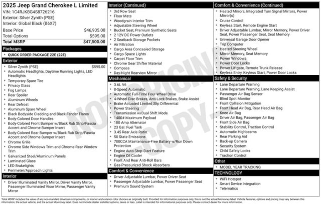 Check out all the standard equipment Quick Order Package 22E, 3.45 Rear Axle Ratio, 3rd row seats: split-bench, 4-Wheel Disc Brakes, 6 Speakers, ABS brakes, Active Noise Control System, Air Conditioning, Alloy wheels, AM/FM radio: SiriusXM with 360L, Anti-whiplash front head restraints, Audio memory, Auto High-beam Headlights, Automatic temperature control, Brake assist, Bumpers: body-color, Capri Leatherette Seats, Compass, Delay-off headlights, Driver door bin, Driver vanity mirror, Dual front impact airbags, Dual front side impact airbags, Electronic Stability Control, Emergency communication system, Four wheel independent suspension, Front anti-roll bar, Front Bucket Seats, Front Center Armrest w/Storage, Front dual zone A/C, Front fog lights, Front reading lights, Fully automatic headlights, Garage door transmitter, Heated door mirrors, Heated front seats, Heated rear seats, Heated steering wheel, Illuminated entry, Knee airbag, Low tire pressure warning, Manual Fold Seatbacks, Memory seat, Model Year Tracking, Navigation System, Normal Duty Suspension, Occupant sensing airbag, Outside temperature display, Overhead airbag, Overhead console, Panic alarm, ParkView Rear Back-Up Camera, Passenger door bin, Passenger vanity mirror, Power door mirrors, Power driver seat, Power Liftgate, Power passenger seat, Power steering, Power windows, Radio data system, Radio: Uconnect 5 Nav w/10.1" Display, Rear air conditioning, Rear anti-roll bar, Rear reading lights, Rear window defroster, Rear window wiper, Reclining 3rd row seat, Remote keyless entry, Security system, Speed control, Speed-Sensitive Wipers, Split folding rear seat, Spoiler, Steering wheel mounted audio controls, Tachometer, Telescoping steering wheel, Tilt steering wheel, Traction control, Trip computer, Turn signal indicator mirrors, Variably intermittent wipers, Voltmeter, and Wheels: 18" x 8.0" Polished/Painted Aluminum. Price includes: $2000 - 2025 National Retail Bonus Cash . Exp. 11/03/2025