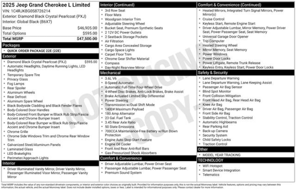 Check out all the standard equipment Quick Order Package 22E, 3.45 Rear Axle Ratio, 3rd row seats: split-bench, 4-Wheel Disc Brakes, 6 Speakers, ABS brakes, Active Noise Control System, Air Conditioning, Alloy wheels, AM/FM radio: SiriusXM with 360L, Anti-whiplash front head restraints, Audio memory, Auto High-beam Headlights, Automatic temperature control, Brake assist, Bumpers: body-color, Capri Leatherette Seats, Compass, Delay-off headlights, Driver door bin, Driver vanity mirror, Dual front impact airbags, Dual front side impact airbags, Electronic Stability Control, Emergency communication system, Four wheel independent suspension, Front anti-roll bar, Front Bucket Seats, Front Center Armrest w/Storage, Front dual zone A/C, Front fog lights, Front reading lights, Fully automatic headlights, Garage door transmitter, Heated door mirrors, Heated front seats, Heated rear seats, Heated steering wheel, Illuminated entry, Knee airbag, Low tire pressure warning, Manual Fold Seatbacks, Memory seat, Model Year Tracking, Navigation System, Normal Duty Suspension, Occupant sensing airbag, Outside temperature display, Overhead airbag, Overhead console, Panic alarm, ParkView Rear Back-Up Camera, Passenger door bin, Passenger vanity mirror, Power door mirrors, Power driver seat, Power Liftgate, Power passenger seat, Power steering, Power windows, Radio data system, Radio: Uconnect 5 Nav w/10.1" Display, Rear air conditioning, Rear anti-roll bar, Rear reading lights, Rear window defroster, Rear window wiper, Reclining 3rd row seat, Remote keyless entry, Security system, Speed control, Speed-Sensitive Wipers, Split folding rear seat, Spoiler, Steering wheel mounted audio controls, Tachometer, Telescoping steering wheel, Tilt steering wheel, Traction control, Trip computer, Turn signal indicator mirrors, Variably intermittent wipers, Voltmeter, and Wheels: 18" x 8.0" Polished/Painted Aluminum. Price includes: $2000 - 2025 National Retail Bonus Cash . Exp. 11/03/2025