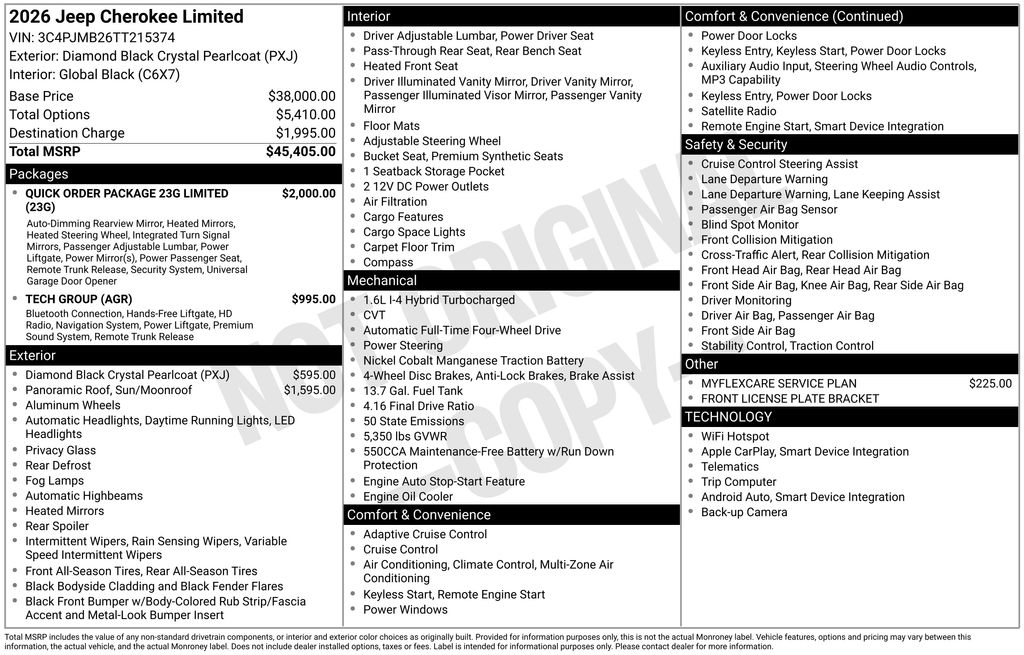 Check out all the standard equipment Quick Order Package 23G Limited (Auto-Dimming Rear-View Mirror, Capri Leatherette Perforated Seats, Cognac Interior Stitching, Exterior Mirrors Courtesy Lamps, Exterior Mirrors with Supplemental Signals, Gloss Black Mirrors, Heated Exterior Mirrors, Heated Steering Wheel, Limited Badge, Power 2-Way Passenger Lumbar Adjust, Power Adjust 6-Way Front Passenger Seat, Power Liftgate, Power Multi-Function Foldaway Mirrors, Security Alarm, Universal Garage Door Opener, and Wireless Charging Pad), Tech Group (4G LTE Wi-Fi Hot Spot, 9 Amplified Speakers with Subwoofer, Alexa Built-in, Apple CarPlay, Global Telematics Box Module (TBM), Google Android Auto, GPS Navigation, Hands Free Power Liftgate, HD Radio, Integrated Voice Command with Bluetooth, Map-in Cluster Display, Off-Road Info Pages, SiriusXM with 360L, Traffic Sign Information, and US/Canada Connectivity), 4-Wheel Disc Brakes, 4.16 Final Drive Ratio, 6 Speakers, ABS brakes, Air Conditioning, Alloy wheels, AM/FM radio: SiriusXM with 360L, Apple CarPlay/Android Auto, Auto High-beam Headlights, Automatic temperature control, Brake assist, Compass, Delay-off headlights, Driver door bin, Driver vanity mirror, Dual front impact airbags, Dual front side impact airbags, Dual-Pane Panoramic Sunroof, Electronic Stability Control, Emergency communication system, Four wheel independent suspension, Front anti-roll bar, Front Bucket Seats, Front Center Armrest, Front dual zone A/C, Front fog lights, Front License Plate Bracket, Front reading lights, Fully automatic headlights, GPS Antenna Input, Heated door mirrors, Heated front seats, Illuminated entry, Knee airbag, Low tire pressure warning, MyFlexCare Service Plan, Occupant sensing airbag, Outside temperature display, Overhead airbag, Overhead console, Panic alarm, ParkView Rear Back-Up Camera, Passenger door bin, Passenger vanity mirror, Power door mirrors, Power driver seat, Power steering, Power windows, Radio data system, Radio: Uconnect 5 with 12.3 Display, Rain sensing wipers, Rear anti-roll bar, Rear reading lights, Rear seat center armrest, Rear side impact airbag, Rear window defroster, Rear window wiper, Remote keyless entry, Soul Cloth Seats with Labyrinth Embossing, Speed control, Speed-sensing steering, Split folding rear seat, Spoiler, Steering wheel mounted audio controls, Tachometer, Telescoping steering wheel, Tilt steering wheel, Traction control, Trip computer, Variably intermittent wipers, Voltmeter, and Wheels: 18 x 7 Machine Face Painted Aluminum. Must qualify for FCA Employee Discount, Price includes: $1000 - 2026 National Stellantis Loyalty Bonus Cash . Exp. 03/31/2026