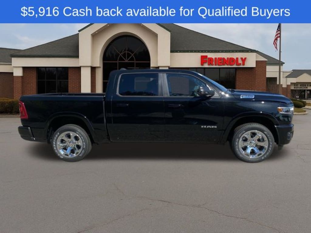 Check out all the standard equipment Big Horn Level 1 Equipment Group (115V Auxiliary Power Outlet, 2nd Row In Floor Storage Bins, 400W Inverter, Auto Power-Folding Mirrors, Auto-Dimming Exterior Driver Mirror, Auto-Dimming Rear-View Mirror, Black Exterior Mirrors, Black Premium Power Mirrors, Convex Wide-Angle Exterior Mirror Insert, Exterior Mirrors Courtesy Lamps, Exterior Mirrors w/Heating Element, Exterior Mirrors w/Supplemental Signals, Glove Box Lamp, Heated Front Seats, Heated Steering Wheel, Leather Wrapped Steering Wheel, Power 2-Way Driver Lumbar Adjust, Power Adjust 8-Way Driver Seat, Power Adjustable Pedals, Rear Power Sliding Window, Rear Window Defroster, Steering Wheel Mounted Audio Controls, Sun Visors w/Illuminated Vanity Mirrors, and Universal Garage Door Opener), Quick Order Package 23Z Big Horn (Big Horn Badge), Sport Appearance Package (3 Rear Seat Head Restraints, 4 Way Front Headrests, Black Interior Accents, Body Color Door Handles, Body Color Front Bumper, Body Color Rear Bumper w/Step Pads, Body Color Tailgate Handle, Bucket Seats, Deluxe Cloth Bucket Seats, Front Seat Back Map Pockets, Full Length Floor Console, Grille Surround 1 Body Color Texture 1 Black, Manual Adjust 4-Way Front Passenger Seat, RAM Grille Badge - Chrome, Rear 60/40 Folding Seat, and Rear Center Armrest), 3.21 Rear Axle Ratio, 4-Wheel Disc Brakes, 4G LTE Wi-Fi Hot Spot, 6 Speakers, ABS brakes, Air Conditioning, Alloy wheels, AM/FM radio, Apple CarPlay/Android Auto, Auto High-beam Headlights, Brake assist, Bumpers: chrome, Cloth Bench Seat, Compass, Connectivity - US/Canada, Delay-off headlights, Driver door bin, Dual front impact airbags, Dual front side impact airbags, Electronic Stability Control, Front anti-roll bar, Front Center Armrest w/Storage, Front fog lights, Front reading lights, Front wheel independent suspension, Fully automatic headlights, GPS Antenna Input, Heated door mirrors, Illuminated entry, Integrated Voice Command w/Bluetooth, Low tire pressure warning, Manual Folding Exterior Mirrors, Manufacturer's Statement of Origin, Occupant sensing airbag, Outside temperature display, Overhead airbag, Overhead console, Panic alarm, ParkView Rear Back-Up Camera, Passenger door bin, Passenger vanity mirror, Power door mirrors, Power steering, Power windows, Radio data system, Radio: Uconnect 5 W w/8.4" Display, Rear anti-roll bar, Rear seat center armrest, Rear step bumper, Remote keyless entry, Speed control, Split folding rear seat, Supplier Part Tracking (J-1), Tachometer, Telescoping steering wheel, Tilt steering wheel, Traction control, Trip computer, USB Host Flip, Variably intermittent wipers, Voltmeter, Wheels: 18" x 8" Cast-Aluminum Painted, and Wheels: 20" x 9" Aluminum Chrome Clad (WRK) Price includes: 10% Msrp - 2025 National 10% Below MSRP . Exp. 11/03/2025