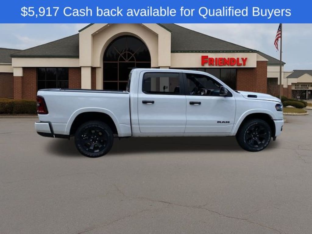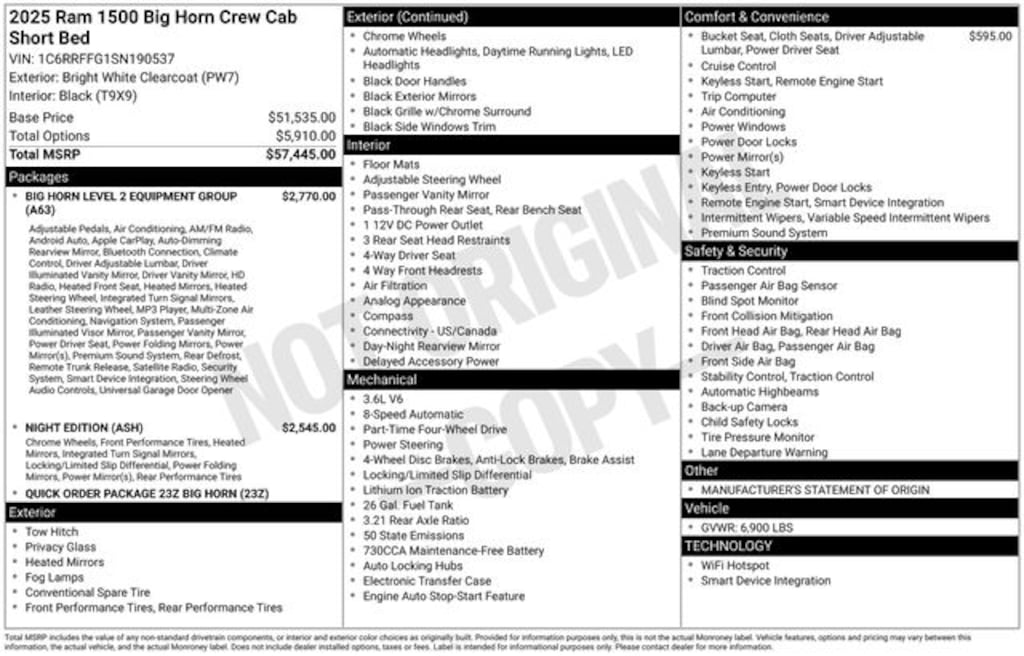 Check out all the standard equipment Big Horn Level 2 Equipment Group (115V Auxiliary Power Outlet, 115V Auxiliary Rear Power Outlet, 12" Touchscreen Display, 2nd Row In Floor Storage Bins, 400W Inverter, 4G LTE Wi-Fi Hot Spot, 9 Amplified Speakers w/Subwoofer, Air Conditioning ATC w/Dual Zone Control, Apple CarPlay, Auto Power-Folding Mirrors, Auto-Dimming Exterior Driver Mirror, Auto-Dimming Rear-View Mirror, Black Exterior Mirrors, Black Premium Power Mirrors, Cluster 7.0" TFT Color Display, Configurable Drive Mode, Connected Travel & Traffic Services, Connectivity - US/Canada, Convex Wide-Angle Exterior Mirror Insert, Exterior Mirrors Courtesy Lamps, Exterior Mirrors w/Heating Element, Exterior Mirrors w/Supplemental Signals, Glove Box Lamp, Google Android Auto, GPS Antenna Input, GPS Navigation, HD Radio, Heated Front Seats, Heated Steering Wheel, Integrated Voice Command w/Bluetooth, Leather Wrapped Steering Wheel, LED Dome Lamp w/On/Off Switch, LED Footwell Lighting, Media Hub w/2 Charge Only USBs, Overhead LED Lamps, Power 2-Way Driver Lumbar Adjust, Power Adjust 8-Way Driver Seat, Power Adjustable Pedals, Premium Overhead Console, Radio: Uconnect 5 Nav w/12.0" Display, Rear Power Sliding Window, Rear Window Defroster, Remote Tailgate Release, Security Alarm, SiriusXM w/360L, Steering Wheel Mounted Audio Controls, Sun Visors w/Illuminated Vanity Mirrors, Universal Garage Door Opener, and USB Host Flip), Night Edition (3 Rear Seat Head Restraints, 4 Way Front Headrests, Accent Color Door Handles, Accent Color Premium Power Mirrors, Accent Color Tailgate Handle, Anti-Spin Differential Rear Axle, Black Exterior Truck Badging, Black Headlamp Bezels, Black Interior Accents, Black Painted Exterior Mirrors Caps, Black Tail Lamp Bezels, Body Color Front Bumper, Body Color Rear Bumper w/Step Pads, Bucket Seats, Deluxe Cloth Bucket Seats, Front Seat Back Map Pockets, Full Length Floor Console, Grille Black Surround Black Mesh, Manual Adjust 4-Way Front Passenger Seat, RAM Grille Badge - Black, Rear 60/40 Folding Seat, Rear Center Armrest, and Wheels: 20" x 9.0" Aluminum Painted Clad), Quick Order Package 23Z Big Horn (Big Horn Badge), 3.21 Rear Axle Ratio, 4-Wheel Disc Brakes, 6 Speakers, ABS brakes, Air Conditioning, Alloy wheels, AM/FM radio, Apple CarPlay/Android Auto, Auto High-beam Headlights, Brake assist, Bumpers: chrome, Cloth Bench Seat, Compass, Delay-off headlights, Driver door bin, Dual front impact airbags, Dual front side impact airbags, Electronic Stability Control, Front anti-roll bar, Front Center Armrest w/Storage, Front fog lights, Front reading lights, Front wheel independent suspension, Fully automatic headlights, Heated door mirrors, Illuminated entry, Low tire pressure warning, Manual Folding Exterior Mirrors, Manufacturer's Statement of Origin, Occupant sensing airbag, Outside temperature display, Overhead airbag, Overhead console, Panic alarm, ParkView Rear Back-Up Camera, Passenger door bin, Passenger vanity mirror, Power door mirrors, Power Price includes: 10% Msrp - 2025 National 10% Below M