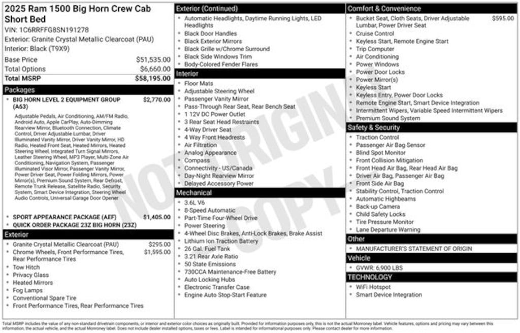 Check out all the standard equipment Big Horn Level 2 Equipment Group (115V Auxiliary Power Outlet, 115V Auxiliary Rear Power Outlet, 12" Touchscreen Display, 2nd Row In Floor Storage Bins, 400W Inverter, 4G LTE Wi-Fi Hot Spot, 9 Amplified Speakers w/Subwoofer, Air Conditioning ATC w/Dual Zone Control, Apple CarPlay, Auto Power-Folding Mirrors, Auto-Dimming Exterior Driver Mirror, Auto-Dimming Rear-View Mirror, Black Exterior Mirrors, Black Premium Power Mirrors, Cluster 7.0" TFT Color Display, Configurable Drive Mode, Connected Travel & Traffic Services, Connectivity - US/Canada, Convex Wide-Angle Exterior Mirror Insert, Exterior Mirrors Courtesy Lamps, Exterior Mirrors w/Heating Element, Exterior Mirrors w/Supplemental Signals, Glove Box Lamp, Google Android Auto, GPS Antenna Input, GPS Navigation, HD Radio, Heated Front Seats, Heated Steering Wheel, Integrated Voice Command w/Bluetooth, Leather Wrapped Steering Wheel, LED Dome Lamp w/On/Off Switch, LED Footwell Lighting, Media Hub w/2 Charge Only USBs, Overhead LED Lamps, Power 2-Way Driver Lumbar Adjust, Power Adjust 8-Way Driver Seat, Power Adjustable Pedals, Premium Overhead Console, Radio: Uconnect 5 Nav w/12.0" Display, Rear Power Sliding Window, Rear Window Defroster, Remote Tailgate Release, Security Alarm, SiriusXM w/360L, Steering Wheel Mounted Audio Controls, Sun Visors w/Illuminated Vanity Mirrors, Universal Garage Door Opener, and USB Host Flip), Quick Order Package 23Z Big Horn (Big Horn Badge), Sport Appearance Package (3 Rear Seat Head Restraints, 4 Way Front Headrests, Black Interior Accents, Body Color Door Handles, Body Color Front Bumper, Body Color Rear Bumper w/Step Pads, Body Color Tailgate Handle, Bucket Seats, Deluxe Cloth Bucket Seats, Front Seat Back Map Pockets, Full Length Floor Console, Grille Surround 1 Body Color Texture 1 Black, Manual Adjust 4-Way Front Passenger Seat, RAM Grille Badge - Chrome, Rear 60/40 Folding Seat, and Rear Center Armrest), 3.21 Rear Axle Ratio, 4-Wheel Disc Brakes, 6 Speakers, ABS brakes, Air Conditioning, Alloy wheels, AM/FM radio, Apple CarPlay/Android Auto, Auto High-beam Headlights, Brake assist, Bumpers: chrome, Cloth Bench Seat, Compass, Delay-off headlights, Driver door bin, Dual front impact airbags, Dual front side impact airbags, Electronic Stability Control, Front anti-roll bar, Front Center Armrest w/Storage, Front fog lights, Front reading lights, Front wheel independent suspension, Fully automatic headlights, Heated door mirrors, Illuminated entry, Low tire pressure warning, Manual Folding Exterior Mirrors, Manufacturer's Statement of Origin, Occupant sensing airbag, Outside temperature display, Overhead airbag, Overhead console, Panic alarm, ParkView Rear Back-Up Camera, Passenger door bin, Passenger vanity mirror, Power door mirrors, Power steering, Power windows, Radio data system, Radio: Uconnect 5 W w/8.4" Display, Rear anti-roll bar, Rear seat center armrest, Rear step bumper, Remote keyless entry, Speed control, Split foldin Price includes: 10% Msrp - 2025 National 10% Below M
