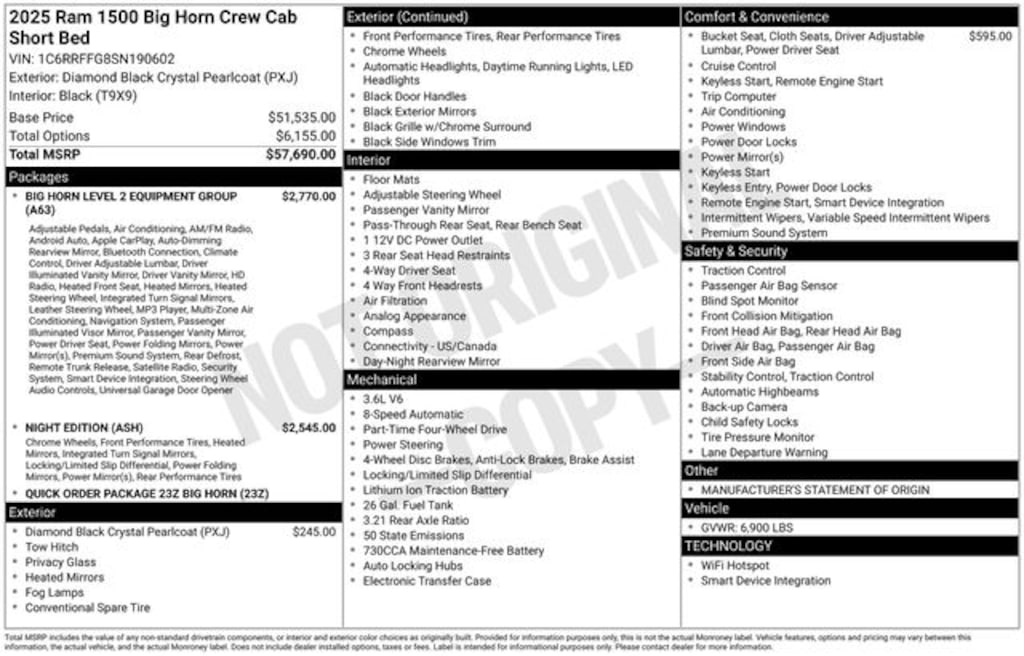 Check out all the standard equipment Big Horn Level 2 Equipment Group (115V Auxiliary Power Outlet, 115V Auxiliary Rear Power Outlet, 12" Touchscreen Display, 2nd Row In Floor Storage Bins, 400W Inverter, 4G LTE Wi-Fi Hot Spot, 9 Amplified Speakers w/Subwoofer, Air Conditioning ATC w/Dual Zone Control, Apple CarPlay, Auto Power-Folding Mirrors, Auto-Dimming Exterior Driver Mirror, Auto-Dimming Rear-View Mirror, Black Exterior Mirrors, Black Premium Power Mirrors, Cluster 7.0" TFT Color Display, Configurable Drive Mode, Connected Travel & Traffic Services, Connectivity - US/Canada, Convex Wide-Angle Exterior Mirror Insert, Exterior Mirrors Courtesy Lamps, Exterior Mirrors w/Heating Element, Exterior Mirrors w/Supplemental Signals, Glove Box Lamp, Google Android Auto, GPS Antenna Input, GPS Navigation, HD Radio, Heated Front Seats, Heated Steering Wheel, Integrated Voice Command w/Bluetooth, Leather Wrapped Steering Wheel, LED Dome Lamp w/On/Off Switch, LED Footwell Lighting, Media Hub w/2 Charge Only USBs, Overhead LED Lamps, Power 2-Way Driver Lumbar Adjust, Power Adjust 8-Way Driver Seat, Power Adjustable Pedals, Premium Overhead Console, Radio: Uconnect 5 Nav w/12.0" Display, Rear Power Sliding Window, Rear Window Defroster, Remote Tailgate Release, Security Alarm, SiriusXM w/360L, Steering Wheel Mounted Audio Controls, Sun Visors w/Illuminated Vanity Mirrors, Universal Garage Door Opener, and USB Host Flip), Night Edition (3 Rear Seat Head Restraints, 4 Way Front Headrests, Accent Color Door Handles, Accent Color Premium Power Mirrors, Accent Color Tailgate Handle, Anti-Spin Differential Rear Axle, Black Exterior Truck Badging, Black Headlamp Bezels, Black Interior Accents, Black Painted Exterior Mirrors Caps, Black Tail Lamp Bezels, Body Color Front Bumper, Body Color Rear Bumper w/Step Pads, Bucket Seats, Deluxe Cloth Bucket Seats, Front Seat Back Map Pockets, Full Length Floor Console, Grille Black Surround Black Mesh, Manual Adjust 4-Way Front Passenger Seat, RAM Grille Badge - Black, Rear 60/40 Folding Seat, Rear Center Armrest, and Wheels: 20" x 9.0" Aluminum Painted Clad), Quick Order Package 23Z Big Horn (Big Horn Badge), 3.21 Rear Axle Ratio, 4-Wheel Disc Brakes, 6 Speakers, ABS brakes, Air Conditioning, Alloy wheels, AM/FM radio, Apple CarPlay/Android Auto, Auto High-beam Headlights, Brake assist, Bumpers: chrome, Cloth Bench Seat, Compass, Delay-off headlights, Driver door bin, Dual front impact airbags, Dual front side impact airbags, Electronic Stability Control, Front anti-roll bar, Front Center Armrest w/Storage, Front fog lights, Front reading lights, Front wheel independent suspension, Fully automatic headlights, Heated door mirrors, Illuminated entry, Low tire pressure warning, Manual Folding Exterior Mirrors, Manufacturer's Statement of Origin, Occupant sensing airbag, Outside temperature display, Overhead airbag, Overhead console, Panic alarm, ParkView Rear Back-Up Camera, Passenger door bin, Passenger vanity mirror, Power door mirro Price includes: 10% Msrp - 2025 National 10% Below M