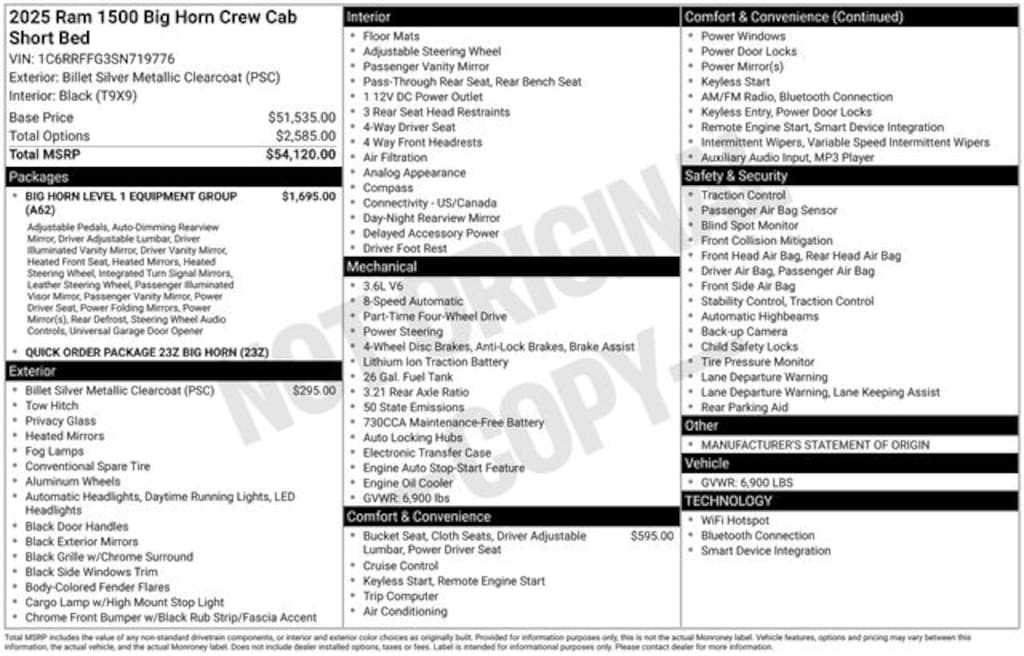 Check out all the standard equipment Big Horn Level 1 Equipment Group (115V Auxiliary Power Outlet, 2nd Row In Floor Storage Bins, 400W Inverter, Auto Power-Folding Mirrors, Auto-Dimming Exterior Driver Mirror, Auto-Dimming Rear-View Mirror, Black Exterior Mirrors, Black Premium Power Mirrors, Convex Wide-Angle Exterior Mirror Insert, Exterior Mirrors Courtesy Lamps, Exterior Mirrors w/Heating Element, Exterior Mirrors w/Supplemental Signals, Glove Box Lamp, Heated Front Seats, Heated Steering Wheel, Leather Wrapped Steering Wheel, Power 2-Way Driver Lumbar Adjust, Power Adjust 8-Way Driver Seat, Power Adjustable Pedals, Rear Power Sliding Window, Rear Window Defroster, Steering Wheel Mounted Audio Controls, Sun Visors w/Illuminated Vanity Mirrors, and Universal Garage Door Opener), Quick Order Package 23Z Big Horn (Big Horn Badge), 3 Rear Seat Head Restraints, 3.21 Rear Axle Ratio, 4 Way Front Headrests, 4-Wheel Disc Brakes, 4G LTE Wi-Fi Hot Spot, 6 Speakers, ABS brakes, Air Conditioning, Alloy wheels, AM/FM radio, Apple CarPlay/Android Auto, Auto High-beam Headlights, Brake assist, Bumpers: chrome, Cloth Bench Seat, Compass, Connectivity - US/Canada, Delay-off headlights, Driver door bin, Dual front impact airbags, Dual front side impact airbags, Electronic Stability Control, Front anti-roll bar, Front Center Armrest w/Storage, Front fog lights, Front reading lights, Front Seat Back Map Pockets, Front wheel independent suspension, Fully automatic headlights, GPS Antenna Input, Heated door mirrors, Illuminated entry, Integrated Voice Command w/Bluetooth, Low tire pressure warning, Manual Adjust 4-Way Front Passenger Seat, Manual Folding Exterior Mirrors, Manufacturer's Statement of Origin, Occupant sensing airbag, Outside temperature display, Overhead airbag, Overhead console, Panic alarm, ParkView Rear Back-Up Camera, Passenger door bin, Passenger vanity mirror, Power door mirrors, Power steering, Power windows, Radio data system, Radio: Uconnect 5 W w/8.4" Display, RAM Grille Badge - Chrome, Rear 60/40 Folding Seat, Rear anti-roll bar, Rear seat center armrest, Rear step bumper, Remote keyless entry, Speed control, Split folding rear seat, Supplier Part Tracking (J-1), Tachometer, Telescoping steering wheel, Tilt steering wheel, Traction control, Trip computer, USB Host Flip, Variably intermittent wipers, Voltmeter, and Wheels: 18" x 8" Cast-Aluminum Painted. Price includes: $1000 - 2025 Midwest BC Regional Bonus Cash. Exp. 11/03/2025 10% Msrp - 2025 National 10% Below MSRP . Exp. 11/03/2025