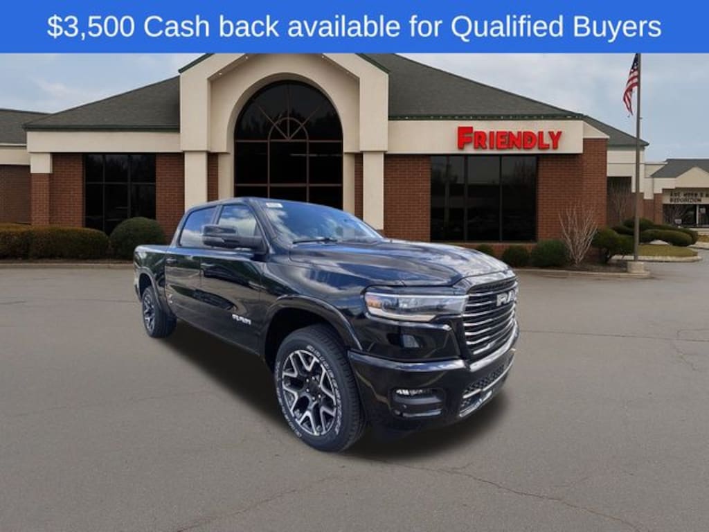 Check out all the standard equipment Laramie Level 2 Equipment Group (14.4" Touchscreen Display, 4G LTE Wi-Fi Hot Spot, Apple CarPlay, Cluster 12" TFT Color Display, Connected Travel & Traffic Services, Connectivity - US/Canada, Disassociated Touchscreen Display, Dual Wireless Charging Pad, Front Passenger Interactive Display, Global Telematics Box Module (TBM), Google Android Auto, GPS Antenna Input, GPS Navigation, harman/kardon 19 Speaker Premium Sound, HD Radio, Integrated Center Stack Radio, Integrated Voice Command w/Bluetooth, Power Tailgate, Radio: Uconnect 5 Nav w/14.4" Display, Rain Sensitive Windshield Wipers, Secondary Active Grille Shutters, SiriusXM Radio Service, SiriusXM w/360L, Smartphone As A Key Capable, and USB Host Flip), Quick Order Package 21H Laramie, Sport Appearance Package (Accent Color Premium Power Mirrors, Auto Power-Folding Mirrors, Auto-Dimming Exterior Driver Mirror, Black Interior Accents, Black Painted Exterior Mirrors Caps, Body Color Front Bumper, Body Color Rear Bumper w/Step Pads, Bridgestone Brand Tires, Convex Wide-Angle Exterior Mirror Insert, Exterior Mirrors Courtesy Lamps, Exterior Mirrors w/Heating Element, Exterior Mirrors w/Memory, Exterior Mirrors w/Supplemental Signals, Grille Surround 3 Body Color Tex 2 Black, RAM Grille Badge - Chrome, and Sport Performance Hood), 10 Speakers, 3.55 Rear Axle Ratio, 4-Wheel Disc Brakes, ABS brakes, Active Noise Control System, Air Conditioning, Alloy wheels, AM/FM radio: SiriusXM with 360L, Apple CarPlay/Android Auto, Audio memory, Auto High-beam Headlights, Auto-dimming door mirrors, Auto-dimming Rear-View mirror, Automatic temperature control, Brake assist, Bumpers: chrome, Chrome Exterior Mirrors, Compass, Delay-off headlights, Driver door bin, Driver vanity mirror, Dual front impact airbags, Dual front side impact airbags, Electronic Stability Control, Front anti-roll bar, Front Bucket Seats, Front Center Armrest w/Storage, Front dual zone A/C, Front fog lights, Front reading lights, Front wheel independent suspension, Fully automatic headlights, Garage door transmitter, Heated door mirrors, Heated front seats, Heated rear seats, Heated steering wheel, Illuminated entry, Leather steering wheel, Leather Trimmed Bucket Seats, Low tire pressure warning, Manufacturer's Statement of Origin, Memory seat, MOPAR Front & Rear Rubber Floor Mats, Navigation System, Occupant sensing airbag, Off-Road Information Pages, Outside temperature display, Overhead airbag, Overhead console, Panic alarm, ParkView Rear Back-Up Camera, Passenger door bin, Passenger vanity mirror, Power door mirrors, Power driver seat, Power passenger seat, Power steering, Power windows, Radio data system, Radio: Uconnect 5 Nav w/12.0" Display, Rear anti-roll bar, Rear reading lights, Rear seat center armrest, Rear step bumper, Remote keyless entry, Security system, Speed control, Split folding rear seat, Steering wheel mounted audio controls, Tachometer, Telescoping steering wheel, Tilt steering wheel, Traction control, Trip Price includes: $3500 - 2026 National Retail Consumer C