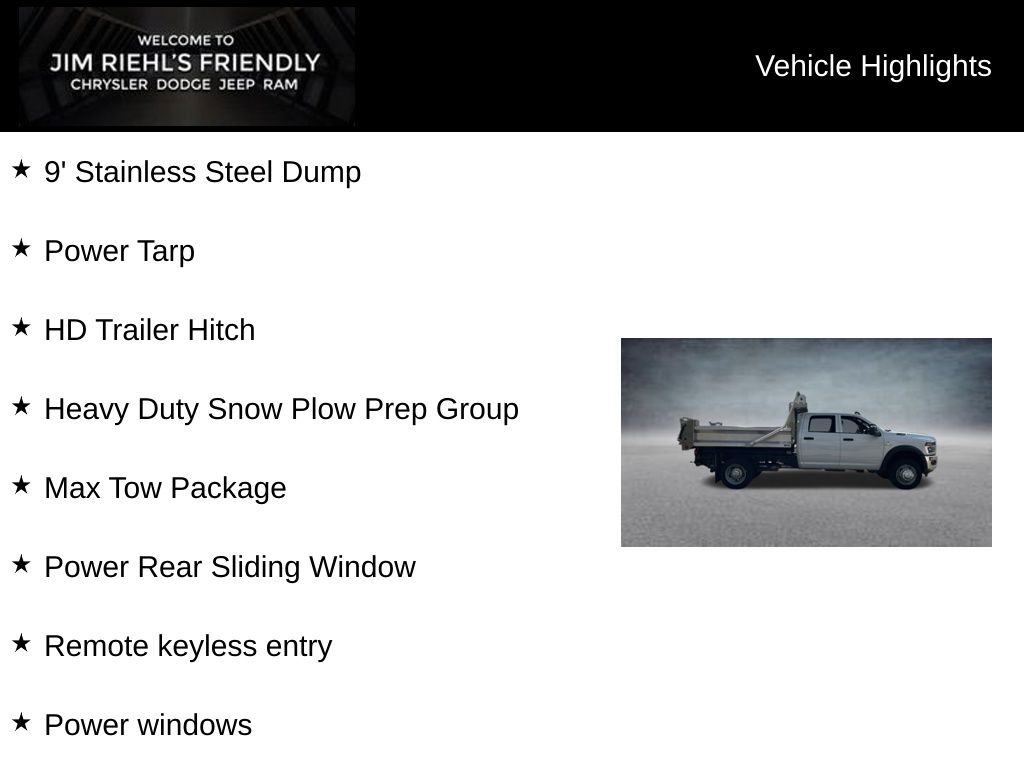9' Stainless Steel Dump, Power Tarp, HD Trailer Hitch, Apple CarPlay, Google Android Auto, Heavy Duty Snow Plow Prep Group, Max Tow Package, Power Rear Sliding Window, Power windows, Remote keyless entry, Trailer Brake Control.