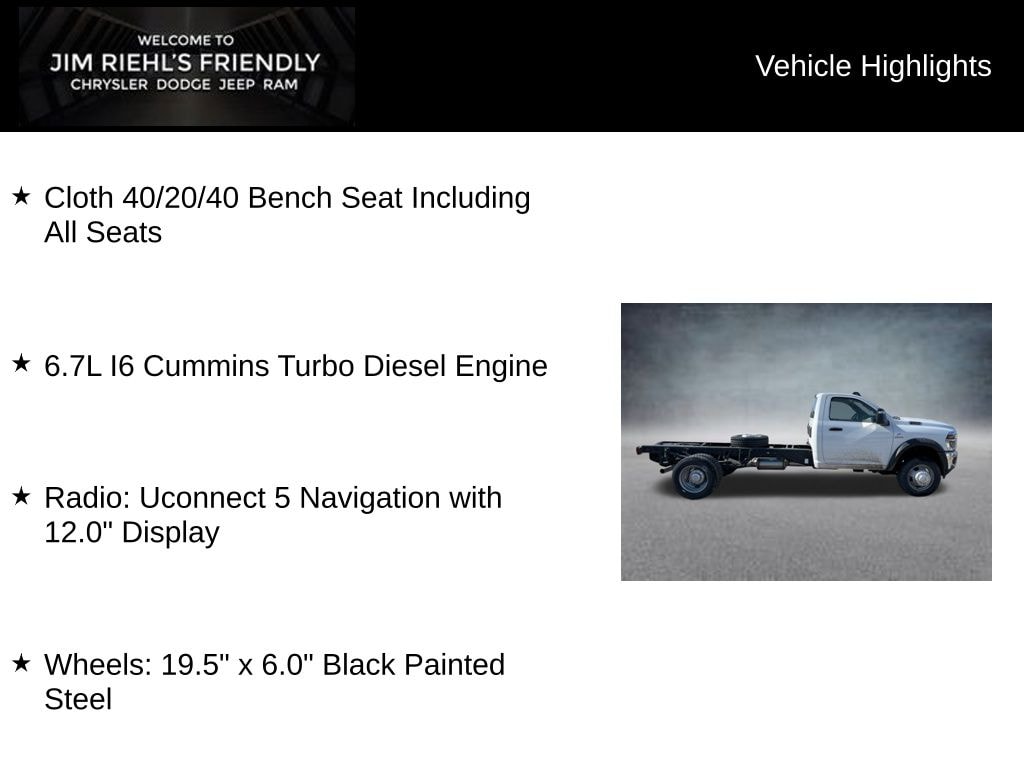 Cloth 40/20/40 Bench Seat Including All Seats, 6.7L I6 Cummins Turbo Diesel Engine, Radio: Uconnect 5 Navigation with 12.0 Display, Wheels: 19.5 x 6.0 Black Painted Steel.