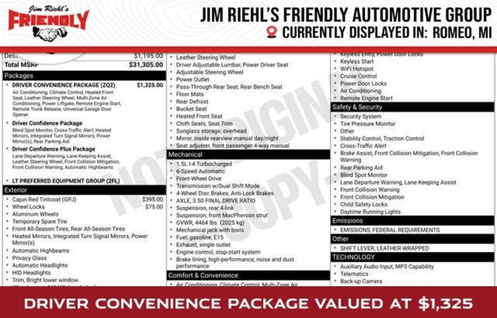 Check out all the standard equipment Driver Confidence Package (Lane Change Alert w/Side Blind Zone Alert, Outside Heated Power-Adjustable Mirrors, Rear Cross Traffic Alert, and Rear Park Assist w/Audible Warning), Driver Confidence Plus Package (3-Spoke Leather-Wrapped Steering Wheel, Following Distance Indicator, Forward Collision Alert, Front Pedestrian Braking, IntelliBeam Auto High Beam Headlamp Control, Lane Keep Assist w/Lane Departure Warning, and Low Speed Forward Automatic Braking), Driver Convenience Package (Rear Power Liftgate, Remote Vehicle Starter System, Universal Home Remote, Dual Zone Automatic Climate Control, Heated Driver & Front Passenger Seats, and Leather-Wrapped Shift Lever), Preferred Equipment Group 2FL, Equinox LT, 4D Sport Utility, 1.5L DOHC, 6-Speed Automatic Electronic with Overdrive, FWD, Cajun Red Tintcoat, Jet Black Cloth, 17" Aluminum Wheels, Apple CarPlay/Android Auto, Bluetooth® For Phone, Power driver seat, 2 Rear USB Charging-Only Ports, 2 USB Ports & Auxiliary Input Jack, 2-Way Power Driver Lumbar Control Seat Adjuster, 3.50 Final Drive Axle Ratio, 4-Wheel Disc Brakes, 6 Speaker Audio System Feature, 6 Speakers, 8-Way Power Driver Seat Adjuster, ABS brakes, Air Conditioning, Alloy wheels, AM/FM radio: SiriusXM, Auto High-beam Headlights, Brake assist, Bumpers: body-color, Compass, Delay-off headlights, Driver door bin, Driver vanity mirror, Dual front impact airbags, Dual front side impact airbags, Electronic Stability Control, Emergency communication system: OnStar and Chevrolet connected services capable, Four wheel independent suspension, Front anti-roll bar, Front Bucket Seats, Front Center Armrest, Front Passenger 4-Way Manual Seat Adjuster, Front reading lights, Fully automatic headlights, Heated door mirrors, High-Intensity Discharge Headlights, Illuminated entry, Low tire pressure warning, Occupant sensing airbag, Outside temperature display, Overhead airbag, Overhead console, Panic alarm, Passenger door bin, Passenger vanity mirror, Power door mirrors, Power steering, Power windows, Premium audio system: Chevrolet MyLink, Premium Cloth Seat Trim, Radio data system, Radio: Chevrolet Infotainment 3 System w/AM/FM, Rear anti-roll bar, Rear reading lights, Rear seat center armrest, Rear window defroster, Rear window wiper, Remote keyless entry, Security system, Set of 4 Wheel Locks (LPO), SiriusXM Radio, Speed control, Speed-sensing steering, Split folding rear seat, Spoiler, Steering wheel mounted audio controls, Tachometer, Telescoping steering wheel, Tilt steering wheel, Traction control, Trip computer, Turn signal indicator mirrors, and Variably intermittent wipers.