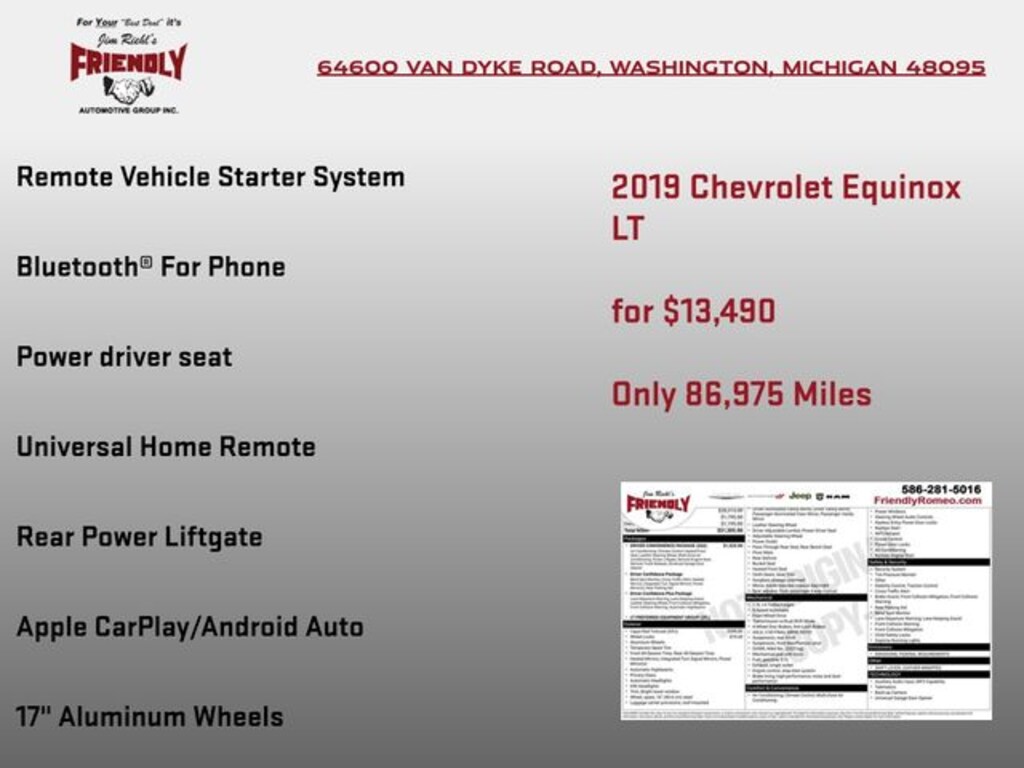 Clean CARFAX. Equinox LT, 4D Sport Utility, 1.5L DOHC, 6-Speed Automatic Electronic with Overdrive, FWD, Cajun Red Tintcoat, Jet Black Cloth, 17" Aluminum Wheels, Apple CarPlay/Android Auto, Bluetooth® For Phone, Power driver seat, Rear Power Liftgate, Remote Vehicle Starter System, Universal Home Remote.