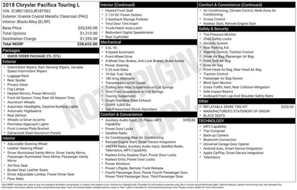 Check out all the standard equipment Inflatable Spare Tire Kit (Portable Air Compressor w/o Sealant), Quick Order Package 27L, Pacifica Touring L, 4D Passenger Van, 3.6L V6 24V VVT, 9-Speed Automatic, FWD, Granite Crystal Metallic Clearcoat, Black/Alloy Leather, Alloy wheels, Apple CarPlay, Apple CarPlay/Android Auto, Power driver seat, Power Liftgate, 17" x 7.0" Aluminum Wheels, 3.25 Axle Ratio, 3rd row seats: split-bench, 4-Wheel Disc Brakes, 6 Speakers, ABS brakes, Air Conditioning, AM/FM radio: SiriusXM, Auto High-beam Headlights, Automatic temperature control, Black Seats, Bodyside moldings, Brake assist, Bumpers: body-color, Compass, Delay-off headlights, Driver door bin, Driver vanity mirror, Driver's Seat Mounted Armrest, Dual front impact airbags, Dual front side impact airbags, Electronic Stability Control, Emergency communication system: Uconnect Access, Four wheel independent suspension, Front anti-roll bar, Front Bucket Seats, Front dual zone A/C, Front fog lights, Front reading lights, Fully automatic headlights, Garage door transmitter, Google Android Auto, GPS Antenna Input, Heated door mirrors, Heated front seats, Illuminated entry, Integrated Voice Command w/Bluetooth, Knee airbag, Leather steering wheel, Low tire pressure warning, Manufacturer's Statement of Origin, Occupant sensing airbag, Outside temperature display, Overhead airbag, Overhead console, Panic alarm, ParkView Rear Back-Up Camera, Passenger door bin, Passenger seat mounted armrest, Passenger vanity mirror, Perforated Leather Trim Bucket Seats, Power door mirrors, Power steering, Power windows, Radio data system, Radio: Uconnect 4 w/7" Display, Rain sensing wipers, Rear air conditioning, Rear reading lights, Rear window defroster, Rear window wiper, Reclining 3rd row seat, Remote keyless entry, Roof rack, Security system, Single Rear Overhead DVD System, SiriusXM Satellite Radio, Speed control, Split folding rear seat, Spoiler, Steering wheel mounted audio controls, Tachometer, Telescoping steering wheel, Tilt steering wheel, Touring Suspension, Traction control, Trip computer, USB Host Flip, Variably intermittent wipers, and Voltmeter.