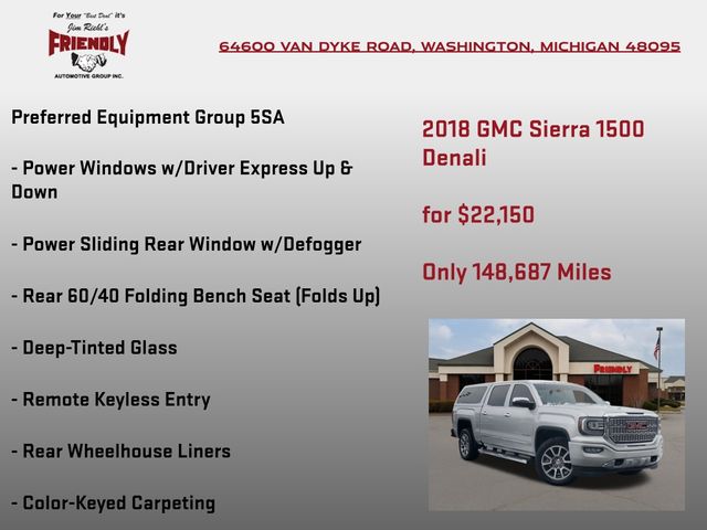 Sierra 1500 Denali, 4D Crew Cab, EcoTec3 5.3L V8, 8-Speed Automatic with Overdrive, 4WD, Quicksilver Metallic, Jet Black Leather, 110-Volt AC Power Outlet, 150 Amp Alternator, 1st & 2nd Row Color-Keyed Carpeted Floor Mats, 2-Speed Active Electronic AutoTrac Transfer Case, 3.42 Rear Axle Ratio, 4-Wheel Disc Brakes, 6" Rectangular Chromed Tubular Assist Steps, 7 Speakers, 8" Multi-Color Customizable Driver Display, ABS brakes, Adaptive suspension, Adjustable pedals, Air Conditioning, Alloy wheels, AM/FM radio: SiriusXM, Auto High-beam Headlights, Auto-dimming door mirrors, Auto-Dimming Inside Rear-View Mirror, Auto-dimming Rear-View mirror, Automatic temperature control, Body Color Lower Front Bumper, Body Color Rear Bumper w/Cornersteps, Bodyside moldings, Bose Speaker System, Brake assist, Bumpers: body-color, CD player, Chrome Bodyside Moldings, Chrome Door Handles, Chrome Mirror Caps, Color-Keyed Carpeting, Compass, Deep-Tinted Glass, Delay-off headlights, Driver & Front Passenger Illuminated Vanity Mirrors, Driver door bin, Driver vanity mirror, Dual front impact airbags, Dual front side impact airbags, Dual-Zone Automatic Climate Control, Electric Rear-Window Defogger, Electronic Stability Control, Enhanced Driver Alert Package, Exterior Parking Camera Rear, EZ Lift & Lower Tailgate, Floor Mounted Console, Forward Collision Alert, Front anti-roll bar, Front Center Armrest w/Storage, Front dual zone A/C, Front fog lights, Front Frame-Mounted Black Recovery Hooks, Front Full Feature Power Reclining Bucket Seats, Front reading lights, Front wheel independent suspension, Fully automatic headlights, Garage door transmitter, GMC 4G LTE, GMC Connected Access, HD Radio, Heated & Ventilated Front Bucket Seats, Heated door mirrors, Heated front seats, Heated steering wheel, Illuminated entry, Integrated Trailer Brake Controller, IntelliBeam Automatic High Beam On/Off Headlight, Lane Keep Assist, Leather Wrapped Heated Steering Wheel, Low Speed Forward Automatic Braking, Low tire pressure warning, MagneRide Magnetic Ride Control Suspension, Manual Tilt/Telescoping Steering Column, Memory seat, Navigation System, Occupant sensing airbag, OnStar & GMC Connected Services Capable, Outside temperature display, Overhead airbag, Overhead console, Panic alarm, Passenger door bin, Passenger vanity mirror, Perforated Leather Appointed Seat Trim, Polished Exhaust Tip, Power Adjustable Pedals, Power door mirrors, Power driver seat, Power Folding & Adjustable Heated Outside Mirrors, Power passenger seat, Power Sliding Rear Window w/Defogger, Power steering, Power windows, Power Windows w/Driver Express Up & Down, Preferred Equipment Group 5SA, Premium audio system: GMC Infotainment System, Radio data system, Radio: AM/FM/GMC Infotainment & Navigation, Rear 60/40 Folding Bench Seat (Folds Up), Rear reading lights, Rear seat center armrest, Rear step bumper, Rear Wheelhouse Liners, Rear window defroster, Remote Keyless Entry, Remote keyless entry, Remote Locking Tailgate, Remote Vehicle Starter System, Security system, Single Slot CD/MP3 Player, SiriusXM Satellite Radio, Speed control, Speed-sensing steering, Split folding rear seat, Steering Wheel Audio Controls, Steering wheel mounted audio controls, Tachometer, Telescoping steering wheel, Theft Deterrent System (Unauthorized Entry), Thin Profile LED Fog Lamps, Tilt steering wheel, Traction control, Trailering Equipment, Trip computer, Turn signal indicator mirrors, Ultrasonic Front & Rear Park Assist, Universal Home Remote, Variably intermittent wipers, Ventilated front seats, Voltmeter, Wheels: 20" x 9" Bright Machi