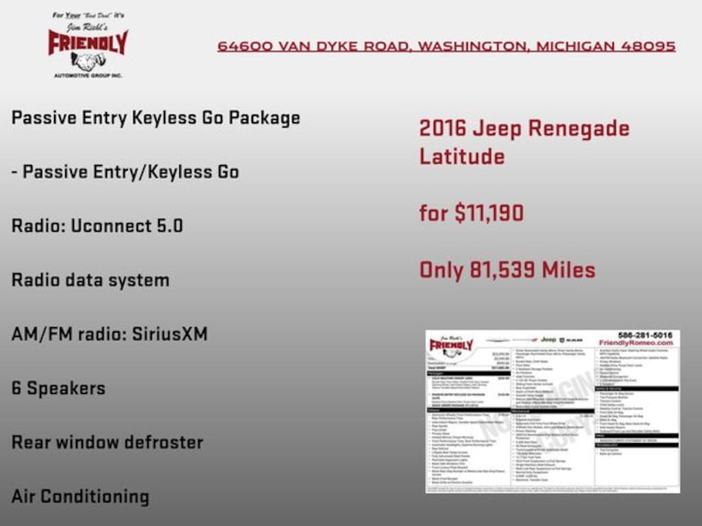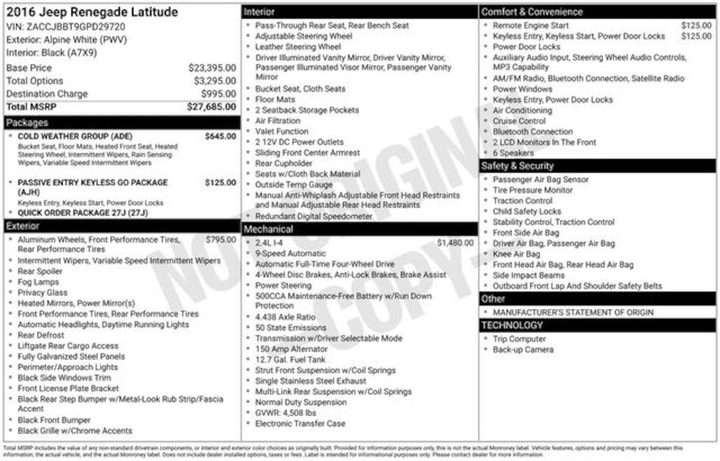 Check out all the standard equipment Cold Weather Group (All-Season Floor Mats, Heated Front Seats, Heated Steering Wheel, Rain Sensitive Windshield Wipers, and Windshield Wiper De-Icer), Passive Entry Keyless Go Package (Passive Entry/Keyless Go), Quick Order Package 27J, Renegade Latitude, 4D Sport Utility, 2.4L I4 MultiAir, 9-Speed 948TE Automatic, 4WD, Alpine White, Black Cloth, 16" x 6.5" Aluminum Wheels, 18" x 7.0" Aluminum Wheels, 4-Wheel Disc Brakes, 6 Speakers, ABS brakes, Air Conditioning, Alloy wheels, AM/FM radio: SiriusXM, Anti-whiplash front head restraints, Brake assist, Cloth Low-Back Bucket Seats, Compass, Delay-off headlights, Driver door bin, Driver vanity mirror, Dual front impact airbags, Dual front side impact airbags, Electronic Stability Control, Four wheel independent suspension, Front anti-roll bar, Front Bucket Seats, Front Center Armrest, Front fog lights, Front reading lights, Fully automatic headlights, Heated door mirrors, Illuminated entry, Knee airbag, Leather steering wheel, Low tire pressure warning, Manufacturer's Statement of Origin, Normal Duty Suspension, Occupant sensing airbag, Outside temperature display, Overhead airbag, Overhead console, Panic alarm, ParkView Rear Back-Up Camera, Passenger door bin, Passenger vanity mirror, Passive Ent