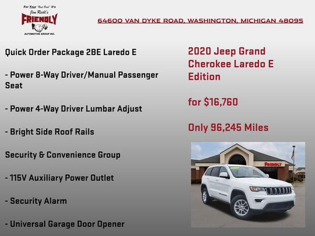 Check out all the standard equipment Quick Order Package 2BE Laredo E (Bright Side Roof Rails, Power 4-Way Driver Lumbar Adjust, and Power 8-Way Driver/Manual Passenger Seat), Security & Convenience Group (115V Auxiliary Power Outlet, Security Alarm, and Universal Garage Door Opener), Grand Cherokee Laredo E, 4D Sport Utility, 3.6L V6 24V VVT, 8-Speed Automatic, 4WD, Bright White Clearcoat, Black Cloth, 3.45 Rear Axle Ratio, 4-Wheel Disc Brakes, 6 Speakers, ABS brakes, Air Conditioning, Alloy wheels, AM/FM radio, Anti-whiplash front head restraints, Apple CarPlay, Apple CarPlay/Android Auto, Automatic temperature control, Brake assist, Bumpers: body-color, Cargo Compartment Cover, Cloth Bucket Seats, Compass, Delay-off headlights, Driver door bin, Driver vanity mirror, Dual front impact airbags, Dual front side impact airbags, Electronic Stability Control, Four wheel independent suspension, Front anti-roll bar, Front Bucket Seats, Front Center Armrest w/Storage, Front dual zone A/C, Front fog lights, Front reading lights, Fully
