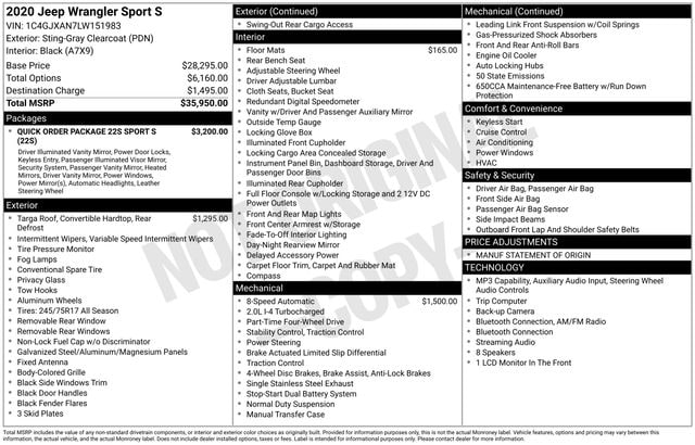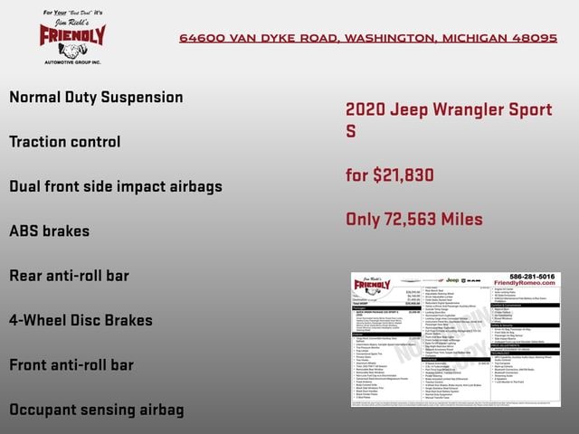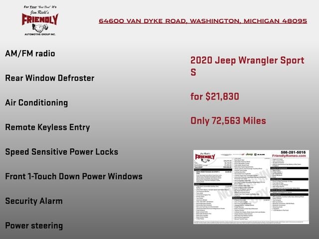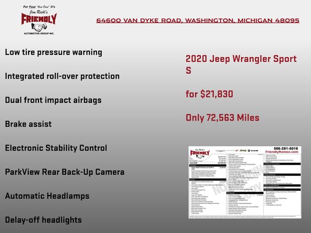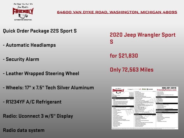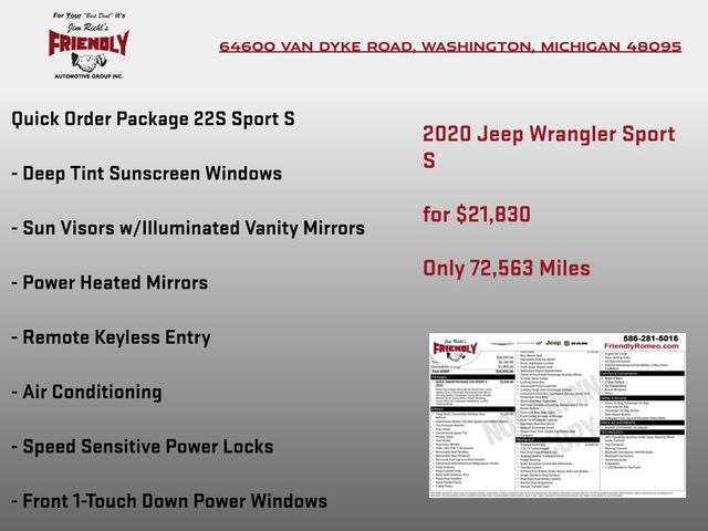 Whether you're seeking the ultimate off-road thrill or a capable daily driver, this 2020 Jeep Wrangler Sport S is the perfect choice. Experience the unmatched freedom and capability that have made the Wrangler an icon. Visit our showroom today and let us put you behind the wheel of this remarkable SUV.