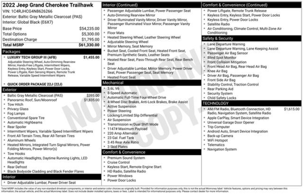 Check out all the standard equipment Luxury Tech Group III (2nd-Row Manual Window Shades, Front/Rear Doors & Liftgate w/Passive Entry, Hands-Free Power Liftgate, Memory Steering Column, Power Tilt/Telescope Steering Column, Rain Sensitive Windshield Wipers, Rearview Autodim Digital Display Mirror, and Wireless Charging Pad), Quick Order Package 22J, Grand Cherokee Trailhawk, 4D Sport Utility, 3.6L V6 24V VVT, 8-Speed Automatic, 4WD, Baltic Gray Metallic Clearcoat, Global Black Leather, 10 Speakers, 10.1" Touchscreen Display, 4G LTE Wi-Fi Hotspot, All Radio Equipped Vehicles, AM/FM radio: SiriusXM with 360L, Apple CarPlay, Audio memory, Connected Travel & Traffic Services, Connectivity - US/Canada, Disassociated Touchscreen Display, Dual-Pane Panoramic Sunroof, For Details, Visit DriveUconnect.com, For More Info, Call 800-643-2112, Global Telematics Box Module (TBM), Google Android Auto, GPS Antenna Input, GPS Navigation, HD Radio, Heated front seats, Heated rear seats, Heated steering wheel, Integrated Center Stack Radio, Integrated Voice Command w/Bluetooth, Memory seat, Navigation System, Power driver seat, Power Liftgate, Radio: Uconnect 5 Nav w/10.1" Display, Remote keyless entry, SiriusXM Radio Service, SiriusXM Satellite Radio, SiriusXM w/360L, USB Host Flip, Wheels: 18" x 8" Machined Face/Painted Aluminum, 3.45 Rear Axle Ratio, 4-Wheel Disc Brakes, ABS brakes, Adaptive suspension, Air Conditioning, Alloy wheels, Anti-whiplash front head restraints, Auto High-beam Headlights, Auto-dimming door mirrors, Auto-dimming Rear-View mirror, Auto-leveling suspension, Automatic temperature control, Brake assist, Bumpers: body-color, Capri Leather/Sued