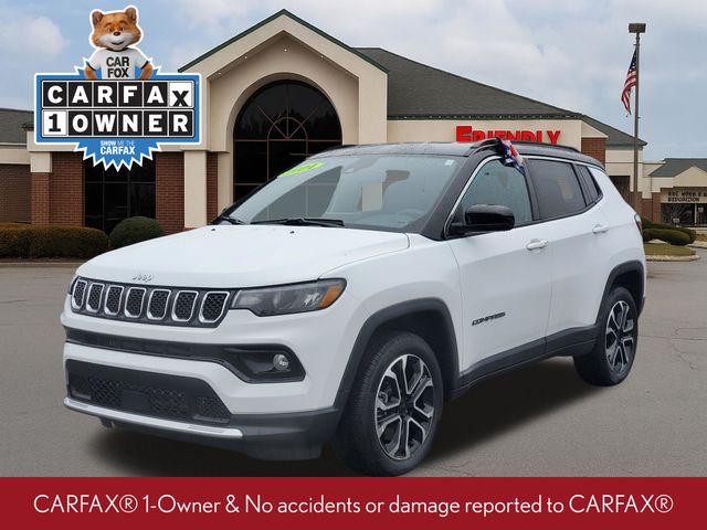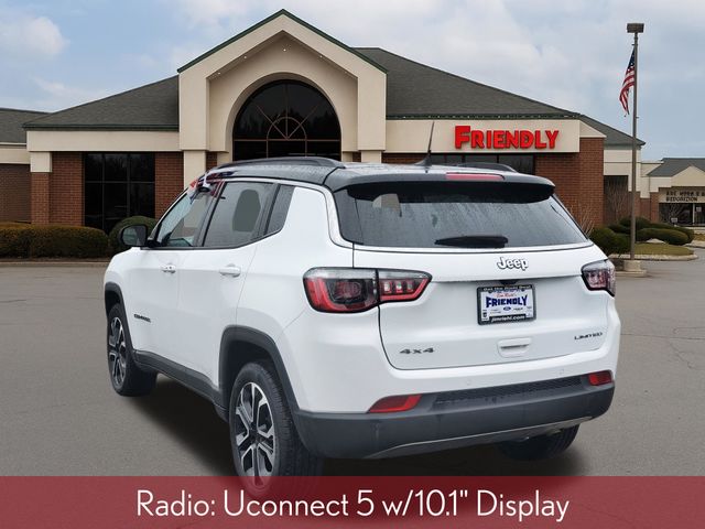 CARFAX One-Owner. Odometer is 28932 miles below market average! Priced below KBB Fair Purchase Price! Compass Limited, 4D Sport Utility, 2.0L I4 DOHC, 8-Speed Automatic, 4WD, Bright White Clearcoat, Black Artificial Leather, 10.1" Touchscreen Display, 3.73 Final Drive Ratio, 4-Wheel Disc Brakes, 4G LTE Wi-Fi Hot Spot, 6 Speakers, ABS brakes, Air Conditioning, Alloy wheels, AM/FM radio: SiriusXM, Auto High-beam Headlights, Auto-dimming Rear-View mirror, Automatic temperature control, Brake assist, Bumpers: body-color, Compass, Delay-off headlights, Disassociated Touchscreen Display, Driver door bin, Driver vanity mirror, Dual front impact airbags, Dual front side impact airbags, Electronic Stability Control, Emergency communication system: Jeep Connect, For Details, Visit DriveUconnect.com, For More Info, Call 800-643-2112, Four wheel independent suspension, Front anti-roll bar, Front Bucket Seats, Front Center Armrest w/Storage, Front dual zone A/C, Front fog lights, Front reading lights, Fully automatic headlights, Global Telematics Box Module (TBM), Heated door mirrors, Heated front seats, Heated steering wheel, Illuminated entry, Knee airbag, Leather Shift Knob, Leather steering wheel, Leatherette Seats, Low tire pressure warning, Occupant sensing airbag, Outside temperature display, Overhead airbag, Overhead console, Panic alarm, ParkView Rear Back-Up Camera, Passenger door bin, Passenger vanity mirror, Power door mirrors, Power driver seat, Power steering, Power windows, Quick Order Package 29G Limited, Radio: Uconnect 5 w/10.1" Display, Rain sensing wipers, Rear anti-roll bar, Rear seat center armrest, Rear window defroster, Rear window wiper, Remote keyless entry, Security system, SiriusXM Guardian - Included Trial (B), SiriusXM Radio Service, Speed control, Split folding rear seat, Spoiler, Steering wheel mounted audio controls, Tachometer, Telescoping steering wheel, Tilt steering wheel, Traction control, Trip computer, Turn signal indicator mirrors, Variably intermittent wipers, Wheels: 18" x 7" Painted Diamond Cut Aluminum.