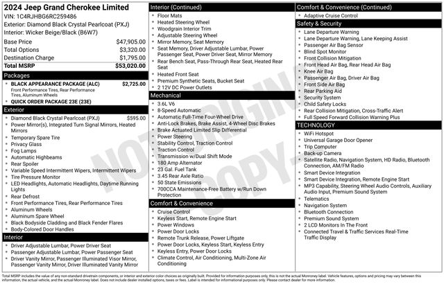 Enhancing the Grand Cherokee's impressive capabilities is the Quick Order Package 23E, which includes a power liftgate, blind-spot monitoring, and a host of advanced safety features. The Black Appearance Package further elevates the vehicle's bold presence with gloss black exterior accents and 20" wheels.
