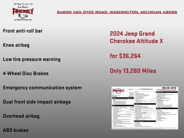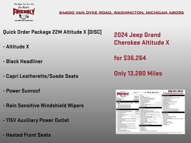 Unlock the power and style of the 2024 Jeep Grand Cherokee Altitude X. This exceptional SUV is the perfect blend of rugged capability and refined sophistication, ready to elevate your driving experience.