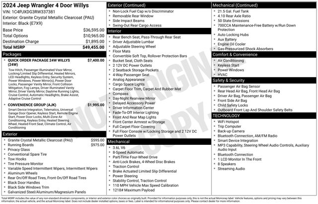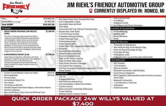 Powered by a robust 3.6L V6 24V VVT engine and an 8-Speed Automatic transmission, this 4WD Wrangler Willys delivers exceptional performance and capability. With its 18 city / 23 highway MPG ratings, you'll enjoy the perfect balance of off-road prowess and fuel efficiency.