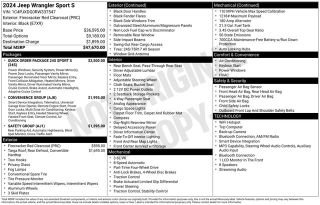 Embrace the spirit of adventure with this exceptional 2024 Jeep Wrangler Sport S. Boasting a striking Firecracker Red Clearcoat exterior, this Wrangler is ready to conquer any terrain with its robust 3.6L V6 24V VVT engine and 8-Speed Automatic 4WD transmission. Packed with an array of premium features, this Wrangler Sport S is the perfect companion for your next off-road excursion or daily commute.