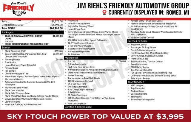This Wrangler Sahara is the perfect blend of rugged capability and refined comfort. The powerful 3.6L V6 engine, paired with an 8-speed automatic transmission and 4-wheel drive, delivers the performance you need to conquer any terrain. The Sky 1-Touch Power Top allows you to seamlessly transition between open-air and enclosed driving, while the Trailer Tow & Aux Switch Group provides the versatility to tackle your towing needs.