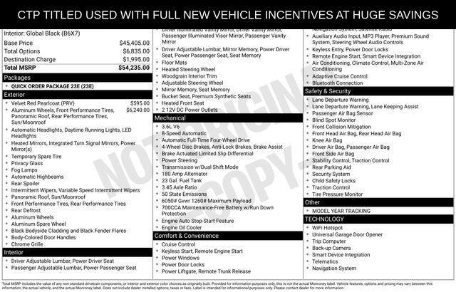 Check out all the standard equipment Blackout Model (Black Painted Roof, Delete Limited Badge, Dual-Pane Panoramic Sunroof, Gloss Black Exterior Accents, and Wheels: 20" x 8.5" Black Painted Aluminum), 4WD, 4-Wheel Disc Brakes, 6 Speakers, ABS brakes, Active Noise Control System, Air Conditioning, Alloy wheels, AM/FM radio: SiriusXM with 360L, Anti-whiplash front head restraints, Audio memory, Auto High-beam Headlights, Automatic temperature control, Brake assist, Bumpers: body-color, Capri Leatherette Seats, Compass, Delay-off headlights, Driver door bin, Driver vanity mirror, Dual front impact airbags, Dual front side impact airbags, Electronic Stability Control, Emergency communication system, Four wheel independent suspension, Front anti-roll bar, Front Bucket Seats, Front Center Armrest w/Storage, Front dual zone A/C, Front fog lights, Front reading lights, Fully automatic headlights, Garage door transmitter, Heated door mirrors, Heated front seats, Heated rear seats, Heated steering wheel, Illuminated entry, Knee airbag, Low tire pressure warning, Memory seat, Model Year Tracking, Navigation System, Normal Duty Suspension, Occupant sensing airbag, Outside temperature display, Overhead airbag, Overhead console, Panic alarm, ParkView Rear Back-Up Camera, Passenger door bin, Passenger vanity mirror, Power door mirrors, Power driver seat, Power Liftgate, Power passenger seat, Power steering, Power windows, Radio data system, Rear anti-roll bar, Rear reading lights, Rear window defroster, Rear window wiper, Remote keyless entry, Security system, Speed control, Speed-Sensitive Wipers, Split folding rear seat, Spoiler, Steering wheel mounted audio controls, Tachometer, Telescoping steering wheel, Tilt steering wheel, Traction control, Trip computer, Turn signal indicator mirrors, Variably intermittent wipers, Voltmeter, and Wheels: 18" x 8" Polished/Painted Aluminum.