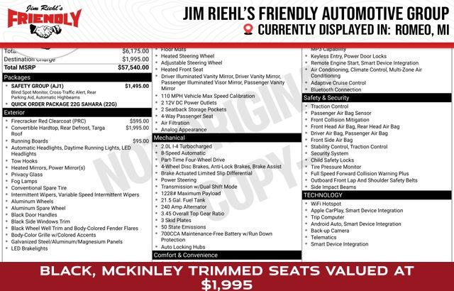 Powered by a 2.0L I4 DOHC engine paired with an 8-Speed Automatic transmission and 4WD, this Wrangler Sahara delivers an exceptional driving experience both on and off the beaten path. With an EPA-estimated 20 city/22 highway mpg, you can explore your surroundings with confidence, knowing you'll get the most out of every gallon.