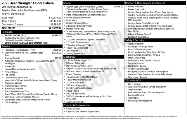 Rugged capability, refined comfort, and advanced technology â" the 2025 Jeep Wrangler Sahara truly has it all. Experience the freedom and versatility that only a Wrangler can provide. Schedule a test drive today and discover how this exceptional SUV can enhance your adventurous lifestyle.