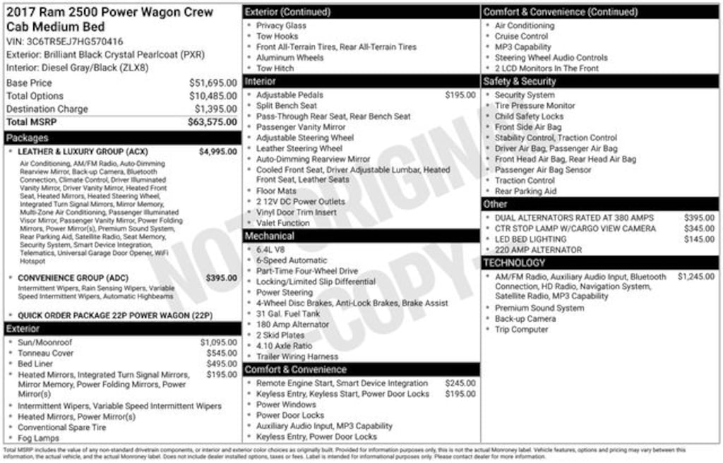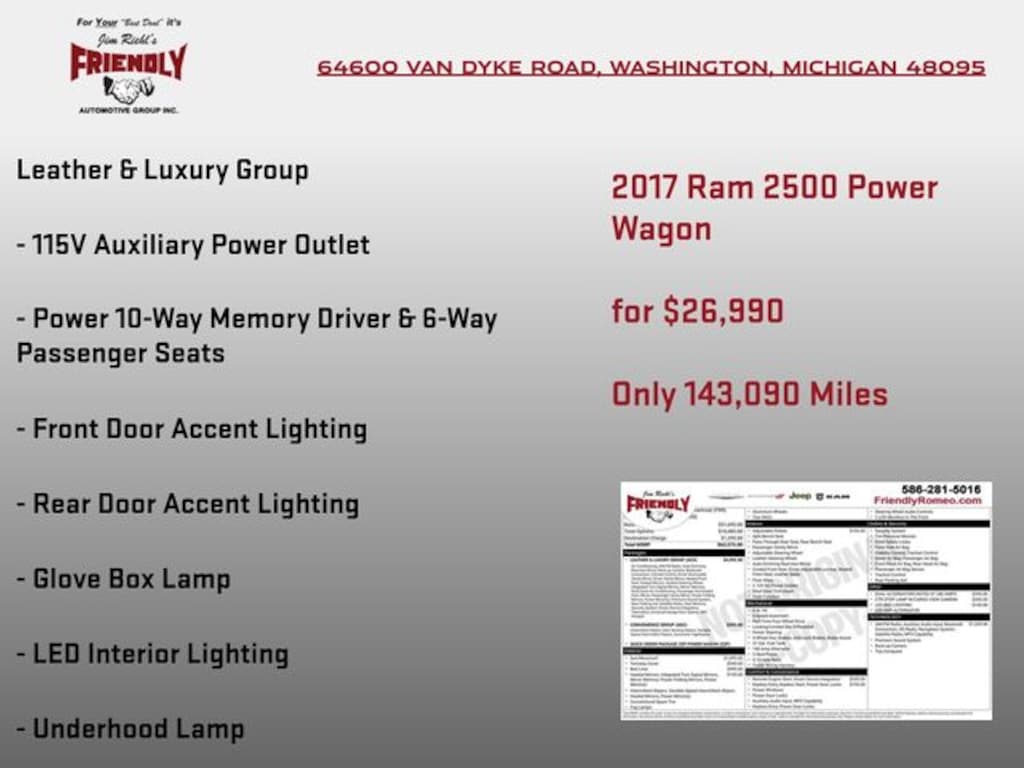 Clean CARFAX. CARFAX One-Owner. 2500 Power Wagon, 4D Crew Cab, 6.4L Heavy Duty V8 HEMI w/MDS, 6-Speed Automatic, 4WD, Brilliant Black Crystal Pearlcoat, Black Leather, 115V Auxiliary Power Outlet, 4.10 Axle Ratio, 9 Alpine Speakers w/Subwoofer, Auto High Beam Headlamp Control, Auto-Dimming Exterior Mirrors, Auto-Dimming Rear-View Mirror, Black Painted Exterior Mirrors, Black Power Fold-Away Mirrors, Charge Only Remote USB Port, Convenience Group, Deluxe Door Trim Panel, Electronic Stability Control, Exterior Mirrors Courtesy Lamps, Exterior Mirrors w/Memory, Exterior Mirrors w/Supplemental Signals, Front Door Accent Lighting, Glove Box Lamp, GPS Navigation, Heated Front Seats, Heated Steering Wheel, KEYLESS GO®, Leather & Luxury Group, Leather Trim 40/20/40 Bench Seat, LED Interior Lighting, Overhead Console w/Garage Door Opener, ParkSense Front/Rear Park Assist System, ParkView Rear Back-Up Camera, Power 10-Way Memory Driver & 6-Way Passenger Seats, Power Adjustable Pedals w/Memory, Power Folding Mirrors, Power Sunroof, Radio: Uconnect 3C w/8.4" Display, Radio/Driver Seat/Mirror Memory, Radio/Driver Seat/Mirrors/Pedals Memory, Rain Sensitive Windshield Wipers, Rear Dome w/On/Off Switch Lamp, Rear Door Accent Lighting, Remote Proximity Keyless Entry, Security Alarm, Spray In Bedliner, Sun Visors w/Illuminated Vanity Mirrors, Underhood Lamp, Universal Garage Door Opener, Wheels: 17" x 8.0" Aluminum w/Matte Black Pocket.