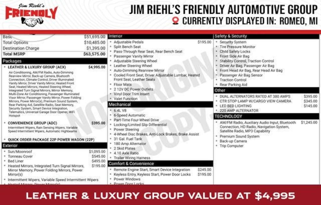 Check out all the standard equipment Convenience Group (Auto High Beam Headlamp Control and Rain Sensitive Windshield Wipers), Leather & Luxury Group (115V Auxiliary Power Outlet, 9 Alpine Speakers w/Subwoofer, Auto-Dimming Exterior Mirrors, Auto-Dimming Rear-View Mirror, Black Painted Exterior Mirrors, Black Power Fold-Away Mirrors, Charge Only Remote USB Port, Deluxe Door Trim Panel, Exterior Mirrors Courtesy Lamps, Exterior Mirrors w/Memory, Exterior Mirrors w/Supplemental Signals, Front Door Accent Lighting, Glove Box Lamp, Heated Front Seats, Heated Steering Wheel, Leather Trim 40/20/40 Bench Seat, LED Interior Lighting, Overhead Console w/Garage Door Opener, ParkSense Front/Rear Park Assist System, ParkView Rear Back-Up Camera, Power 10-Way Memory Driver & 6-Way Passenger Seats, Power Folding Mirrors, Radio: Uconnect 3C w/8.4" Display, Radio/Driver Seat/Mirror Memory, Rear Dome w/On/Off Switch Lamp, Rear Door Accent Lighting, Security Alarm, Sun Visors w/Illuminated Vanity Mirrors, Underhood Lamp, Universal Garage Door Opener, 40/20/40 Split Bench Seat, 6 Month Trial (Registration Required), 8.4" Touchscreen Display, Air Conditioning ATC w/Dual Zone Control, Folding Flat Load Floor Storage, For Details Visit DriveUconnect.com, Front Armrest w/Cupholders, Front Center Seat Cushion Storage, GPS Antenna Input, High Back Seats, Integrated Voice Command w/Bluetooth, Media Hub (USB, AUX), Nav-Capable! See Dealer for Details, Power Lumbar Adjust, Rear 60/40 Split Folding Seat, SiriusXM Satellite Radio, Uconnect Access, and Ventilated Front Seats), Quick Order Package 22P Power Wagon (Flat