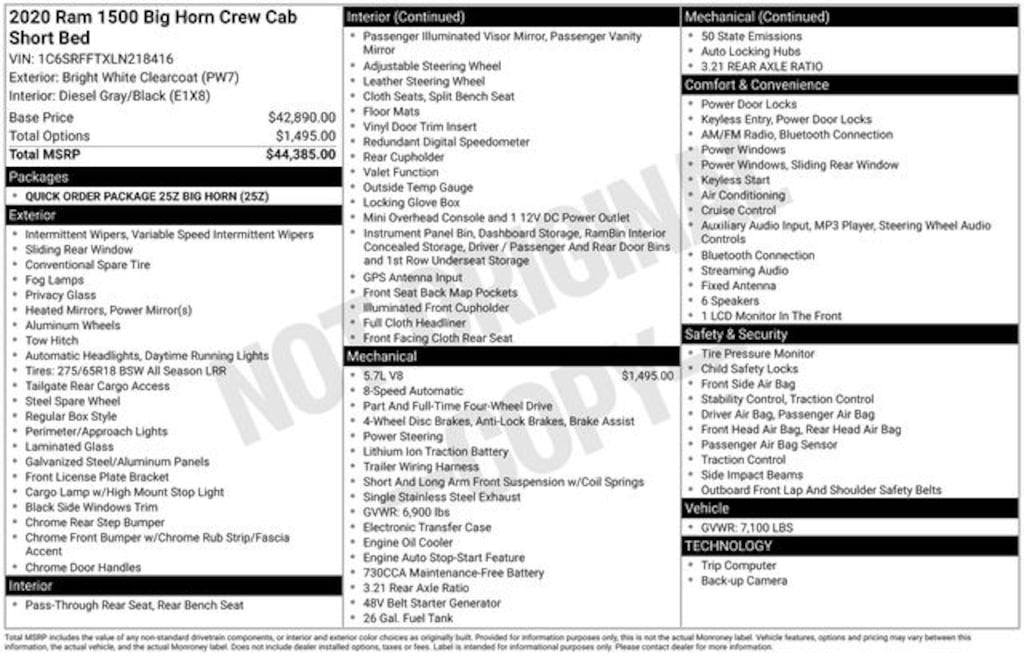 Check out all the standard equipment Quick Order Package 25Z Big Horn (Big Horn Badge), 1500 Big Horn/Lone Star, 4D Crew Cab, HEMI 5.7L V8 Multi Displacement VVT, 8-Speed Automatic, 4WD, Bright White Clearcoat, Black Cloth, 48V Belt Starter Generator, Brake assist, Bumpers: chrome, Electronic Stability Control, Wheels: 18" x 8" Cast-Aluminum Painted, 3 Rear Seat Head Restraints, 3.21 Rear Axle Ratio, 4 Way Front Headrests, 4-Wheel Disc Brakes, 6 Speakers, ABS brakes, Air Conditioning, Alloy wheels, AM/FM radio, Cloth Bench Seat, Compass, Delay-off headlights, Driver door bin, Dual front impact airbags, Dual front side impact airbags, Front anti-roll bar, Front Center Armrest w/Storage, Front fog lights, Front reading lights, Front Seat Back Map Pockets, Front wheel independent suspension, Fully automatic headlights, GPS Antenna Input, Heated door mirrors, Illuminated entry, Leather steering wheel, Low tire pressure warning, Occupant sensing airbag, Outside temperature display, Overhead airbag, Overhead console, Panic alarm, ParkView Rear Back-Up Camera, Passenger door bin, Passenger vanity mirror, Power door mirrors, Power steering, Power windows, Radio data system, Radio: Uconnect 3 w/5" Display, Rear 60/40 Folding Seat, Rear anti-roll bar, Rear seat center armrest, Rear step bumper, Remote keyless entry, Speed control, Split folding rear seat, Steering wheel mounted audio controls, Tachometer, Telescoping steering wheel, Tilt steering wheel, Traction control, Trip computer, Variably intermittent wipers, and Voltmeter.