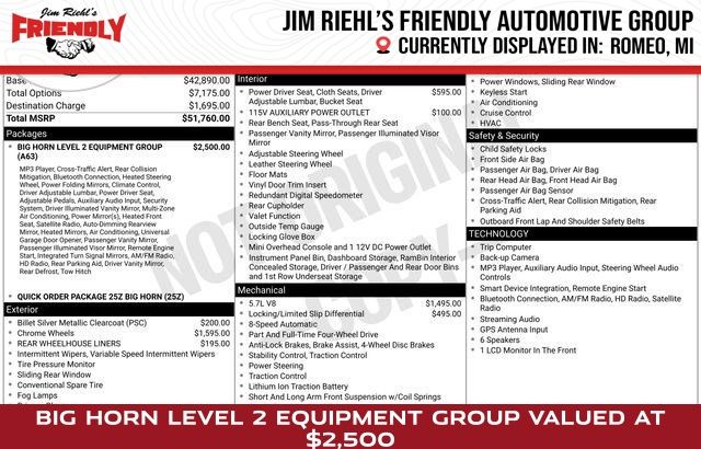 Inside, the Big Horn/Lone Star trim level offers a wealth of premium features and technologies to enhance your driving experience. The Uconnect 4 infotainment system with an 8.4-inch touchscreen display puts your music, navigation, and connectivity at your fingertips. Enjoy the convenience of remote start, the comfort of heated front seats and a heated steering wheel, and the versatility of the 115V auxiliary power outlet.
