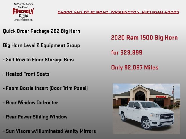 2020 Ram 1500 Big Horn/Lone Star Bright White Clearcoat Big Horn/Lone Star HEMI 5.7L V8 Multi Displacement VVT 8-Speed Automatic 4WD 15/21 City/Highway MPG